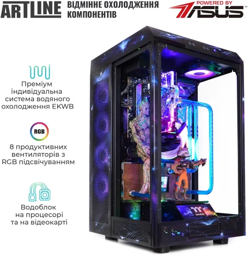 Комп'ютер ARTLINE Overlord Guardian Windows 11 Pro (Guardianv03) - це потужний ігровий та кастомний системний блок, створений в Україні. Оснащений 16-ядерним процесором AMD Ryzen™ 9 9950X3D із частотою 4.3–5.7 ГГц та преміальною системою водяного охолодження EKWB Water Cooling Premium. Вбудовано 96 ГБ оперативної пам'яті DDR5-6400 для максимальної багатозадачності та швидкодії. Сховище представлене двома надшвидкими SSD NVMe Gen5: 2 ТБ + 2 ТБ, загальним обсягом 4 ТБ. Графічна потужність забезпечується відеокартою NVIDIA GeForce RTX 5090 із 32 ГБ пам'яті. Материнська плата ROG CROSSHAIR X870E HERO на базі чіпсету AMD X870E гарантує стабільність та розширені можливості. Корпус The Tower 900 Custom із загартованим склом, RGB-підсвічуванням та 9 вентиляторами 120 мм з адресним LED-підсвічуванням забезпечує ефективне охолодження та стильний зовнішній вигляд. Блок живлення на 1600 Вт із сертифікатом 80+ Gold гарантує надійність. Підтримка Wi-Fi 802.11be, Bluetooth 5.4, мережна карта 2.5Gb+5Gb, а також безліч передніх та задніх портів роблять ПК універсальним. Працює під керуванням Windows 11 Pro. Гарантія – 38 місяців.