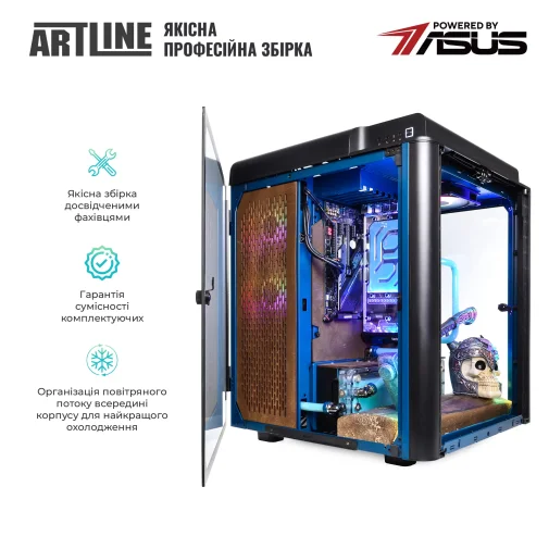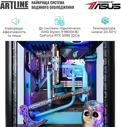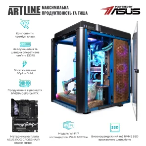 Комп'ютер ARTLINE Overlord VALHALLA Windows 11 Pro (VALHALLAv24Win) - це високопродуктивний ігровий та кастомний ПК преміум-класу, створений в Україні. Оснащений потужним 8-ядерним процесором AMD Ryzen 7 9800X3D (4.7–5.2 ГГц) із розблокованим множником та кастомною системою водяного охолодження EKWB Water Cooling Premium. Величезний обсяг оперативної пам'яті 96GB DDR5-6400 забезпечує плавну роботу у будь-яких завданнях, а сумарний обсяг накопичувачів 4TB (2TB NVMe Gen5 + 2TB NVMe Gen5 Basic) гарантує неймовірну швидкість завантаження та зберігання даних. За графіку відповідає відеокарта нового покоління NVIDIA GeForce RTX 5090 з 32GB пам'яті. Материнська плата ROG CROSSHAIR X870E HERO на чіпсеті AMD X870E забезпечує стабільність та розширені можливості підключення. Корпус Thermaltake Level 20 HT Custom із загартованим склом та RGB-підсвічуванням створює унікальний стиль, а шість 120мм RGB-вентиляторів підтримують оптимальне охолодження. Система живлення збудована на модульному блоці 1600W 80+ Gold. Комп'ютер підтримує сучасні бездротові технології (Wi-Fi 802.11be, Bluetooth 5.4), оснащений широким набором портів вводу-виводу, включаючи USB4, USB 3.2, Type-C, HDMI та DisplayPort. Працює під керуванням Windows 11 Pro та поставляється у фірмовому стилі Assassin's Creed Valhalla. Гарантія – 38 місяців.