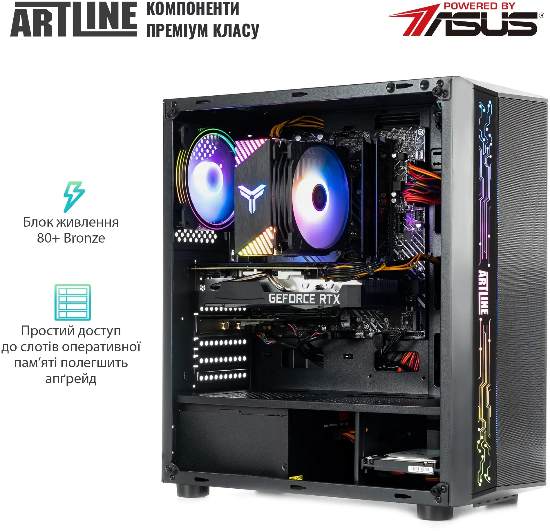 Комп’ютер ARTLINE Overlord X83 Windows 11 Home (X83v53Win) – потужний ігровий системний блок на базі AMD Ryzen 7 7700 з 8 ядрами та частотою до 5.3 ГГц. Оснащений відеокартою NVIDIA GeForce RTX 5070 12GB, 16 ГБ оперативної пам’яті DDR5-5600 і високопродуктивним SSD 1 ТБ NVMe, що забезпечує високу швидкодію та стабільну роботу в сучасних іграх. Материнська плата на чипсеті AMD B650, блок живлення 750 Вт із сертифікацією 80+ Bronze та корпус QUBE BREEZE ARGB із загартованим склом і RGB-підсвіткою створюють надійну та збалансовану конфігурацію. Комп’ютер постачається з попередньо встановленою операційною системою Windows 11 Home.