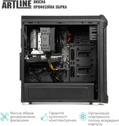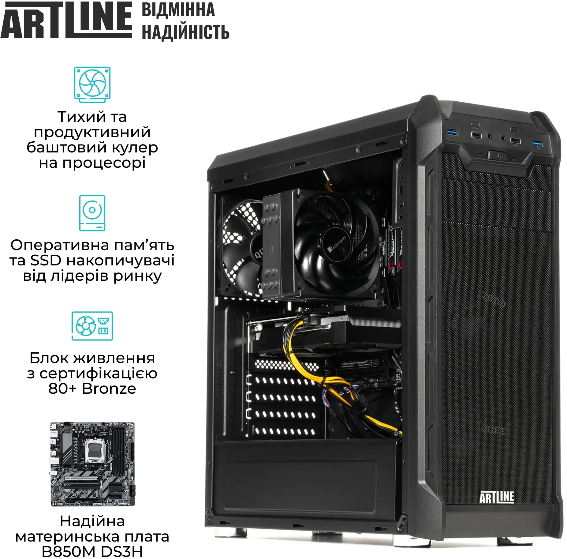 Робоча станція ARTLINE WorkStation W56 Windows 11 Pro (W56v11Win) – продуктивне рішення для професійних задач, що поєднує потужне апаратне забезпечення та надійну роботу в інтенсивних навантаженнях. Оснащена процесором AMD 8-core Ryzen 7 7700 3.8-5.3GHz, який забезпечує високу обчислювальну потужність для роботи з вимогливими програмами, рендерингом і обробкою даних. За графічну продуктивність відповідає NVIDIA RTX PRO 2000, що дозволяє ефективно працювати з професійними задачами. Обсяг оперативної пам’яті становить 32GB DDR5-6000, що забезпечує стабільну роботу при багатозадачності та роботі з великими проєктами. Для зберігання даних передбачено 2TB M.2 NVMe, що гарантує швидкий доступ до файлів і системи. Материнська плата B850M DS3H забезпечує стабільність роботи та можливості для розширення. Блок живлення 650W 80+ Bronze гарантує надійне енергопостачання всіх компонентів. Встановлена Windows 11 Pro. Корпус QUBE SUCCESSOR виконаний у сучасному дизайні з сітчастою передньою та верхньою панелями, що забезпечують ефективну вентиляцію. Оснащений трьома вентиляторами: двома 120 мм спереду та одним 120 мм ззаду для оптимального охолодження компонентів. На передній панелі зручно розташовані інтерфейси USB та аудіороз’єми для швидкого підключення периферії.