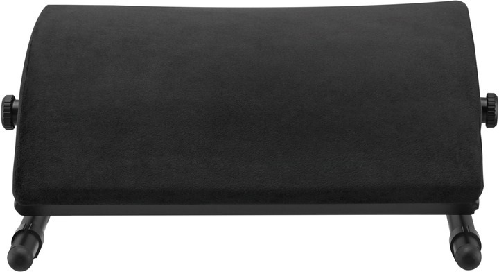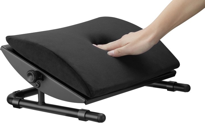 Регульована підставка для ніг OfficePro FR960B — це ергономічний аксесуар у чорному кольорі, призначений для забезпечення комфорту під час тривалого сидіння в офісі, вдома чи під час ігрових сесій, допомагаючи зменшити навантаження на ноги, поперек і спину.