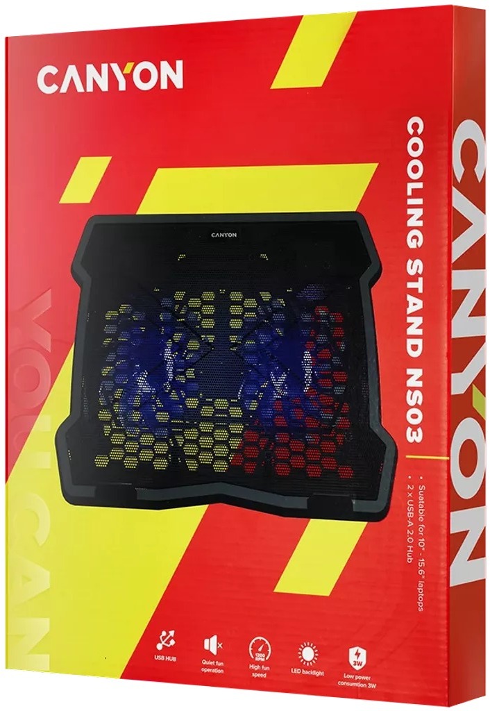 Підставка для охолодження ноутбуків Canyon NS-03 підходить для пристроїв із діагоналлю екрана від 10 до 15.6 дюймів, включаючи MacBook. Вона оснащена двома вентиляторами розміром 125 х 125 х 15 мм, які працюють зі швидкістю від 800 до 1000 об/хв. Це забезпечує ефективне відведення тепла, що сприяє стабільній роботі ноутбука в умовах спеки або під час виконання складних завдань.