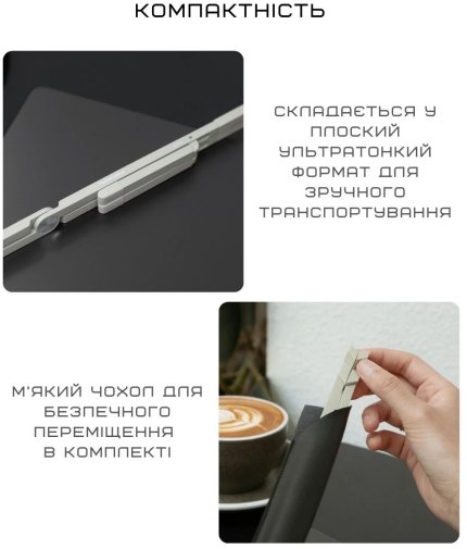 Підставка має ультратонкий і легкий дизайн та складається у пласку форму, що робить її ідеальною для щоденного транспортування. Вона легко поміщається у рюкзак, сумку або чохол для ноутбука, а м’який захисний чохол у комплекті забезпечує безпечне зберігання та комфорт у дорозі.