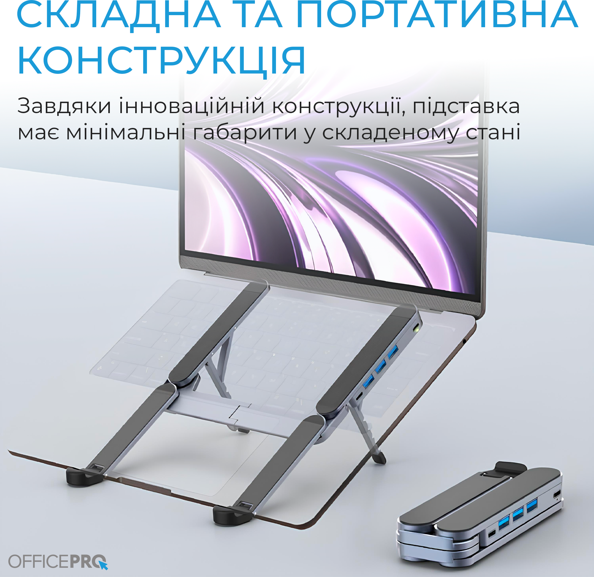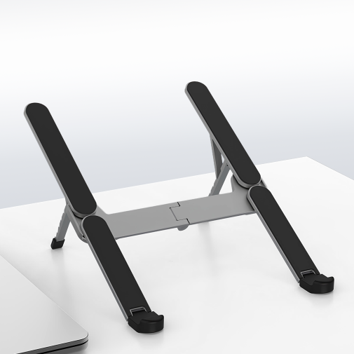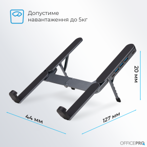 Підставка має складну та портативну конструкцію: завдяки інноваційному механізму вона має мінімальні габарити у складеному стані, що дозволяє легко брати її з собою в поїздки, офіс або на навчання. Незважаючи на компактність, виріб витримує допустиме навантаження до 5 кг, що робить його придатним для використання з ноутбуками різної ваги, включаючи потужні ігрові та робочі моделі.