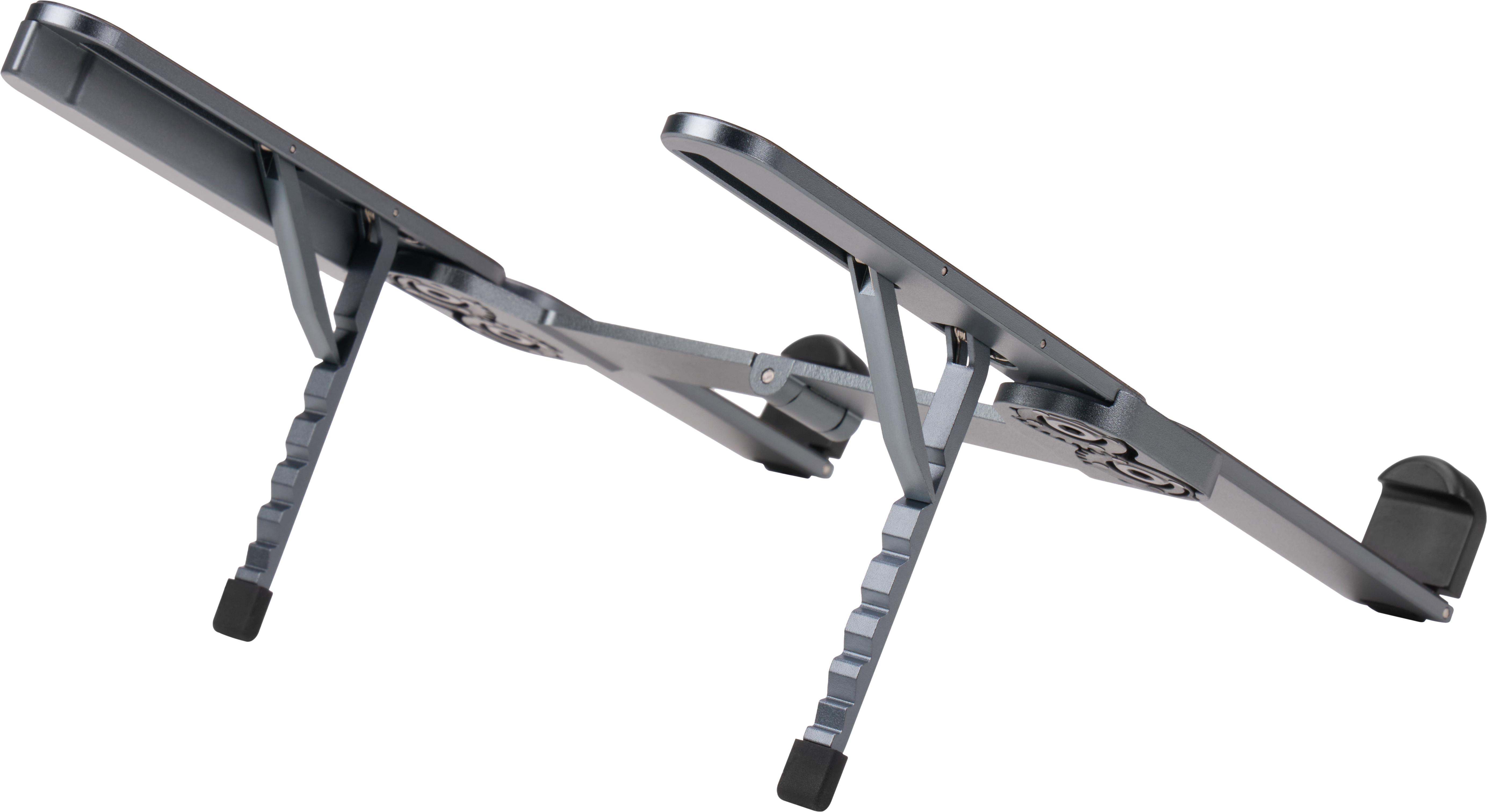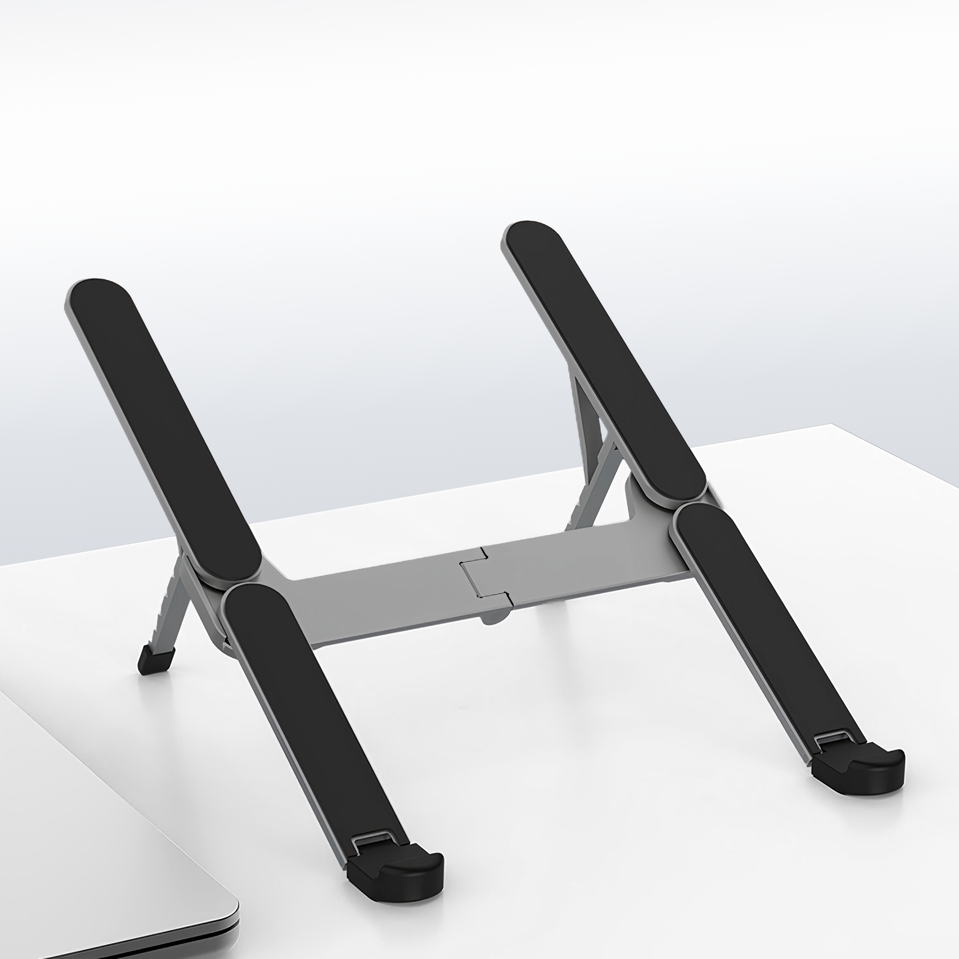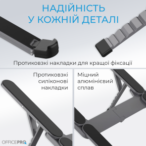 Особливу увагу приділено надійності в кожній деталі. Підставка оснащена протиковзкими накладками для кращої фіксації ноутбука: силіконові елементи запобігають ковзанню, а міцний алюмінієвий сплав забезпечує довговічність та стабільність конструкції.