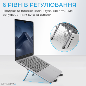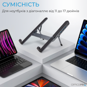 Конструкція забезпечує 6 рівнів регулювання – ви можете налаштовувати кут нахилу та висоту ноутбука, обираючи ідеальне положення для комфортної роботи, перегляду контенту або презентацій. Підставка сумісна з ноутбуками діагоналлю від 11 до 17 дюймів, що робить її універсальним аксесуаром для більшості сучасних пристроїв.