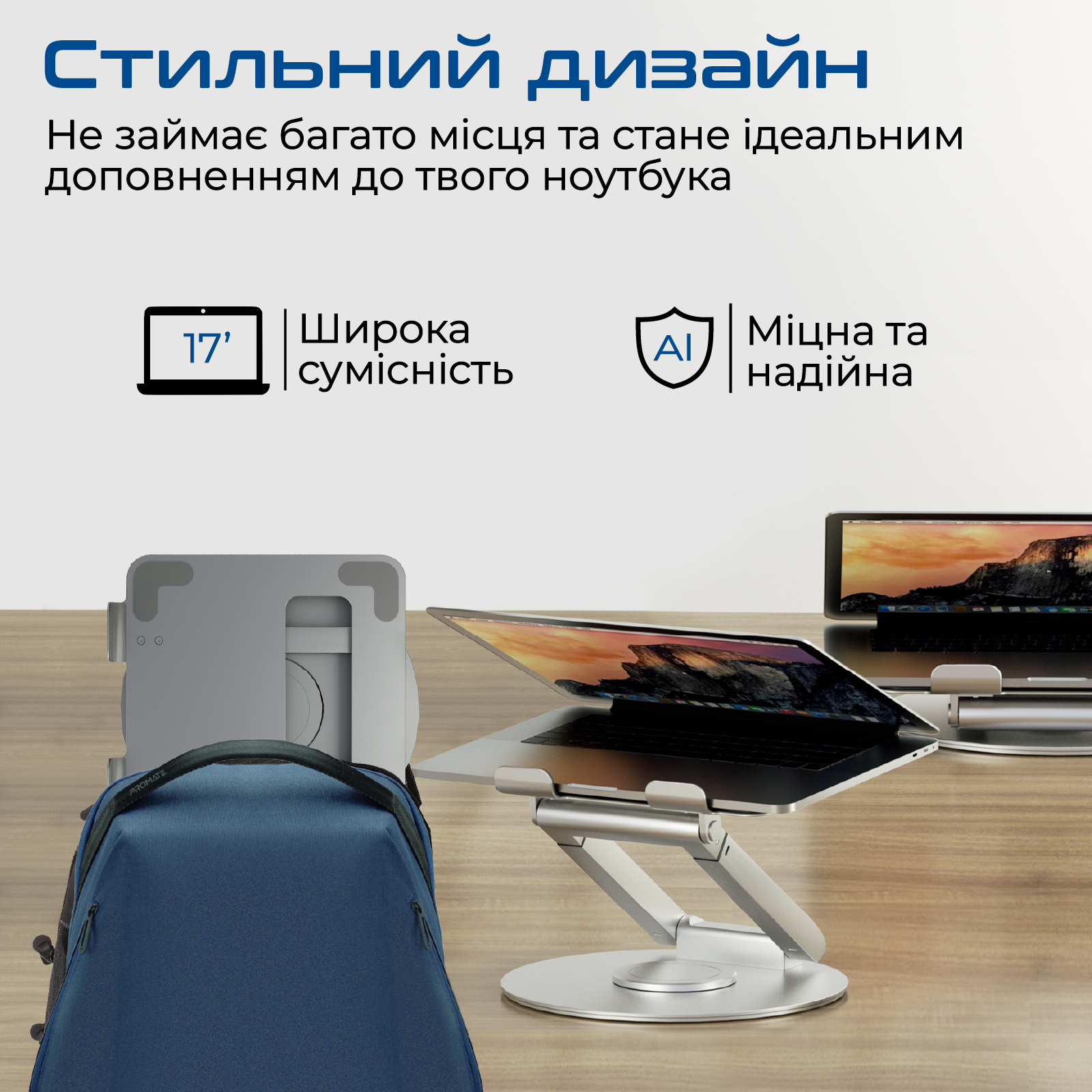 DeskMate-6 — покращена версія популярної підставки DeskMate-4 від Promate. Повертай ноутбук на 360⁰, регулюй кут нахилу та висоту, щоб з комфортом працювати навіть стоячи за столом.