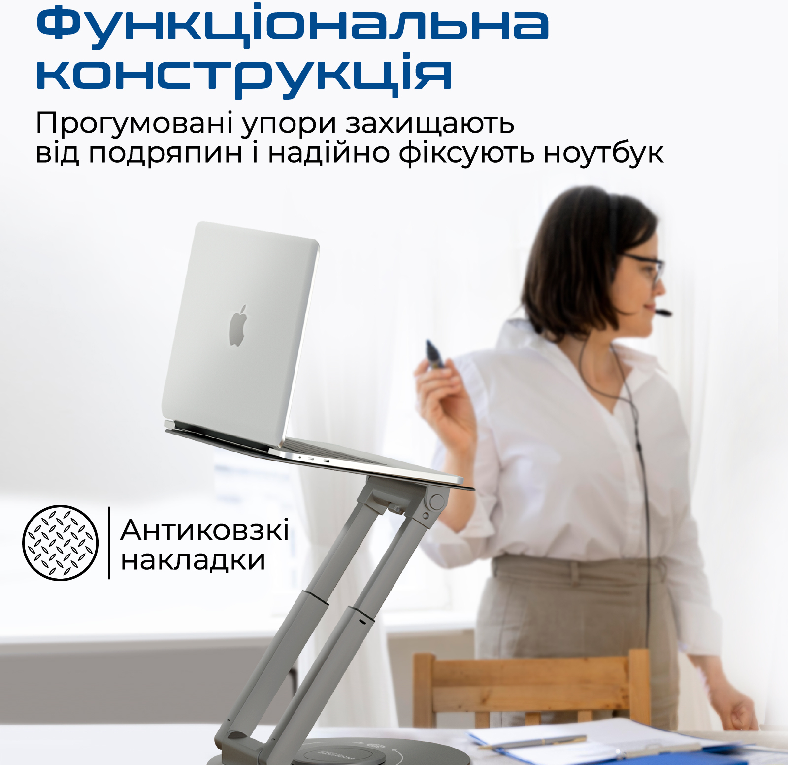 Антиковзні накладки в парі з прогумованими упорами захищають від подряпин і надійно фіксують ноутбук.