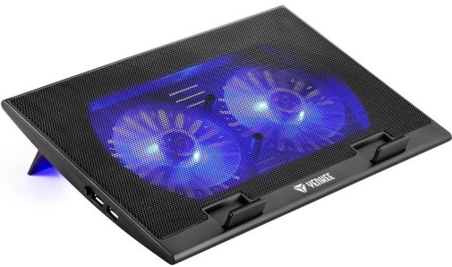 Ця модель оснащена тихими вентиляторами з LED-підсвічуванням, яке створює м'який блакитний ефект для візуальної привабливості, а також двома USB 2.0 портами для синхронізації даних чи зарядки зовнішніх пристроїв (один порт використовується для живлення підставки).