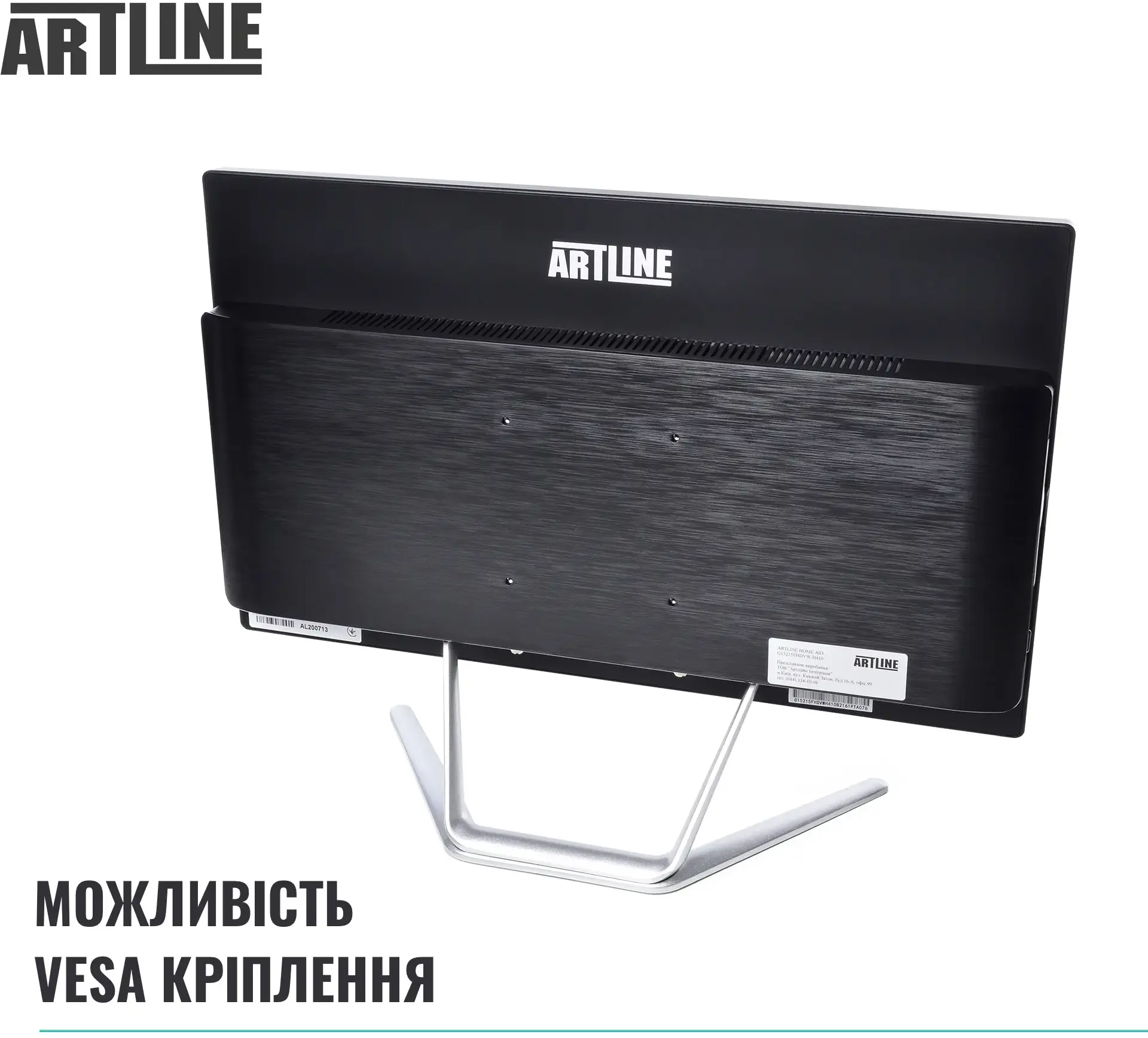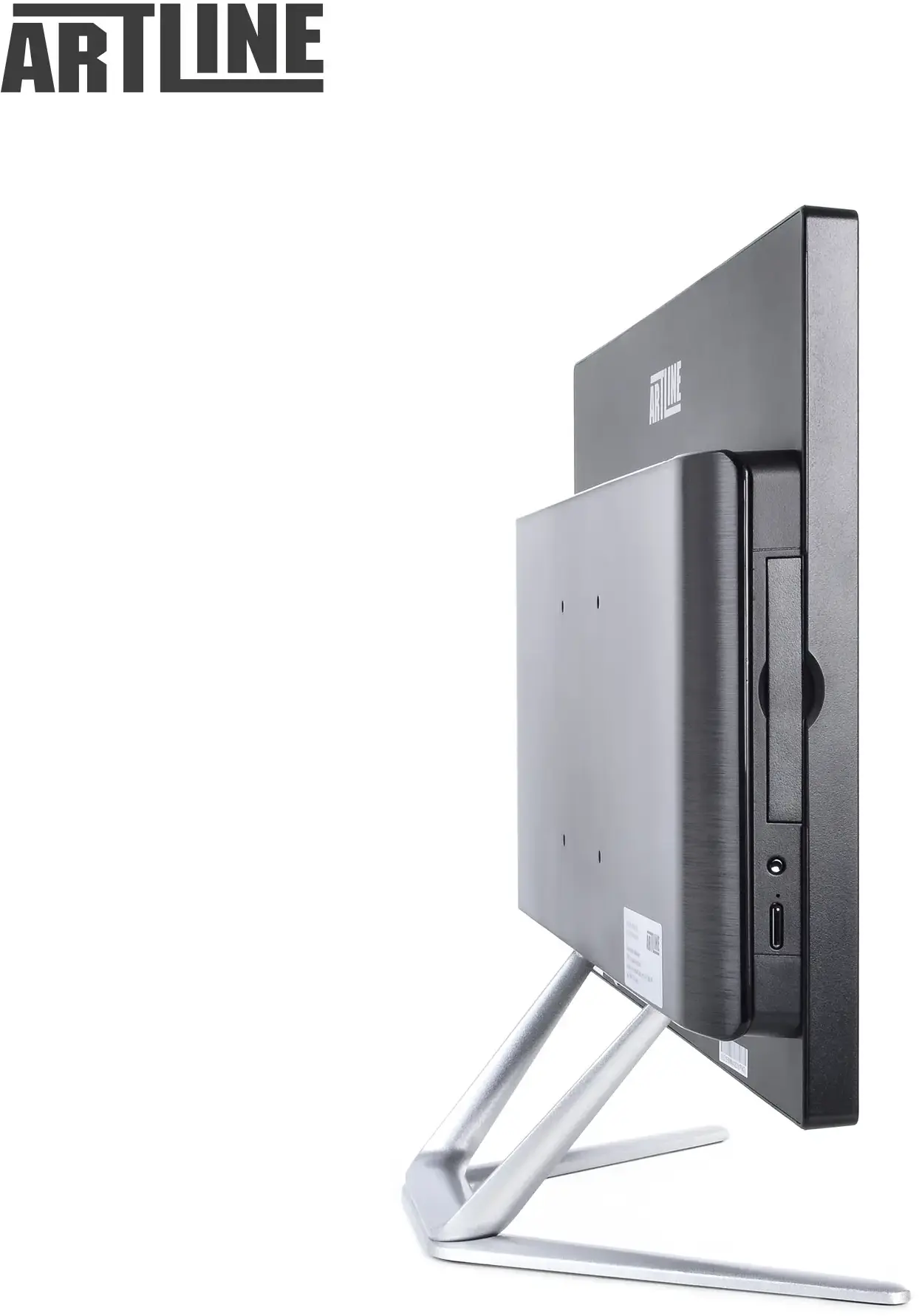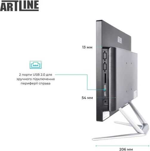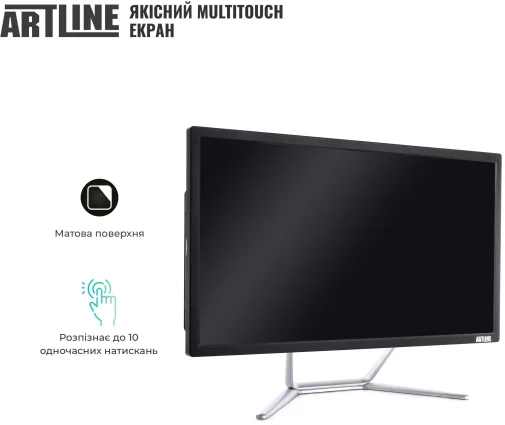 Моноблок виконаний у елегантному кольоровому поєднанні, яке гармонійно вписується як в офісний інтер’єр, так і в домашній кабінет. Компактний корпус Artline AiO Multitouch має мінімалістичний дизайн і продуману ергономіку. Пристрій важить лише 7 кг при розмірах 500 × 375 × 54 мм, завдяки чому легко розміщується навіть на невеликому робочому столі. Підтримка VESA-кріплення дозволяє за потреби закріпити моноблок на стіні або спеціальній стійці.