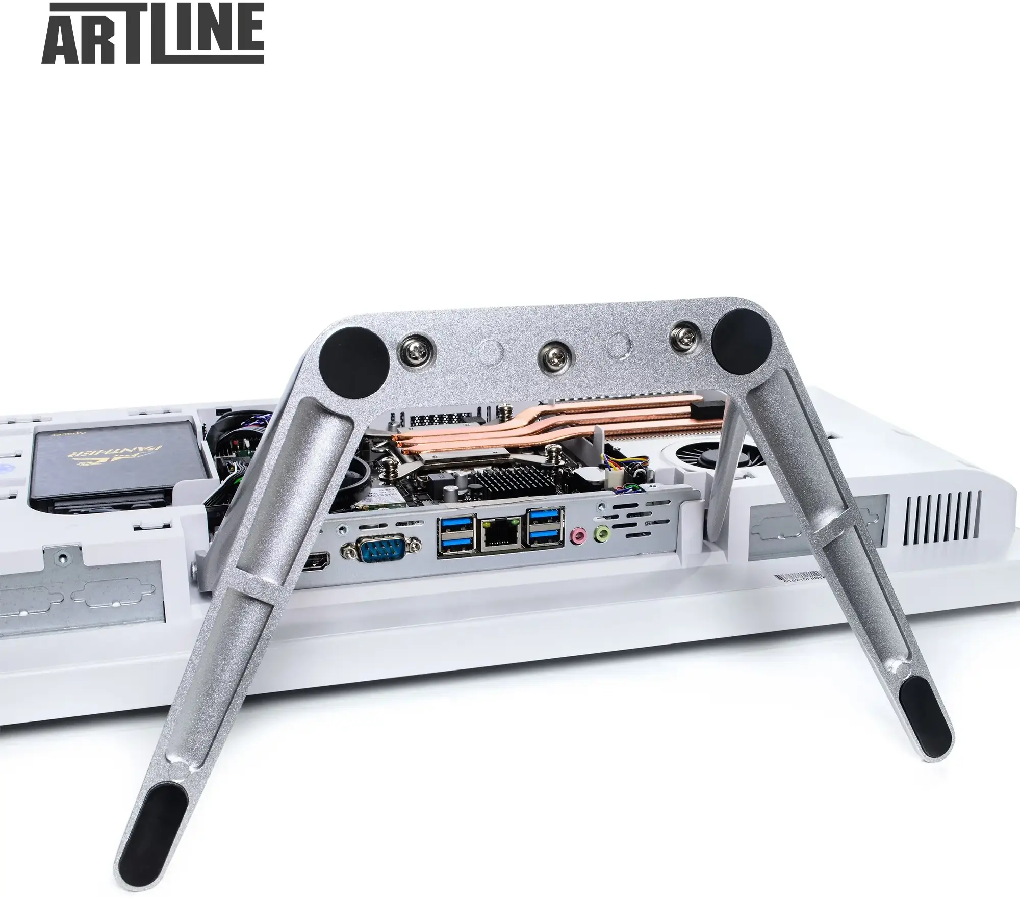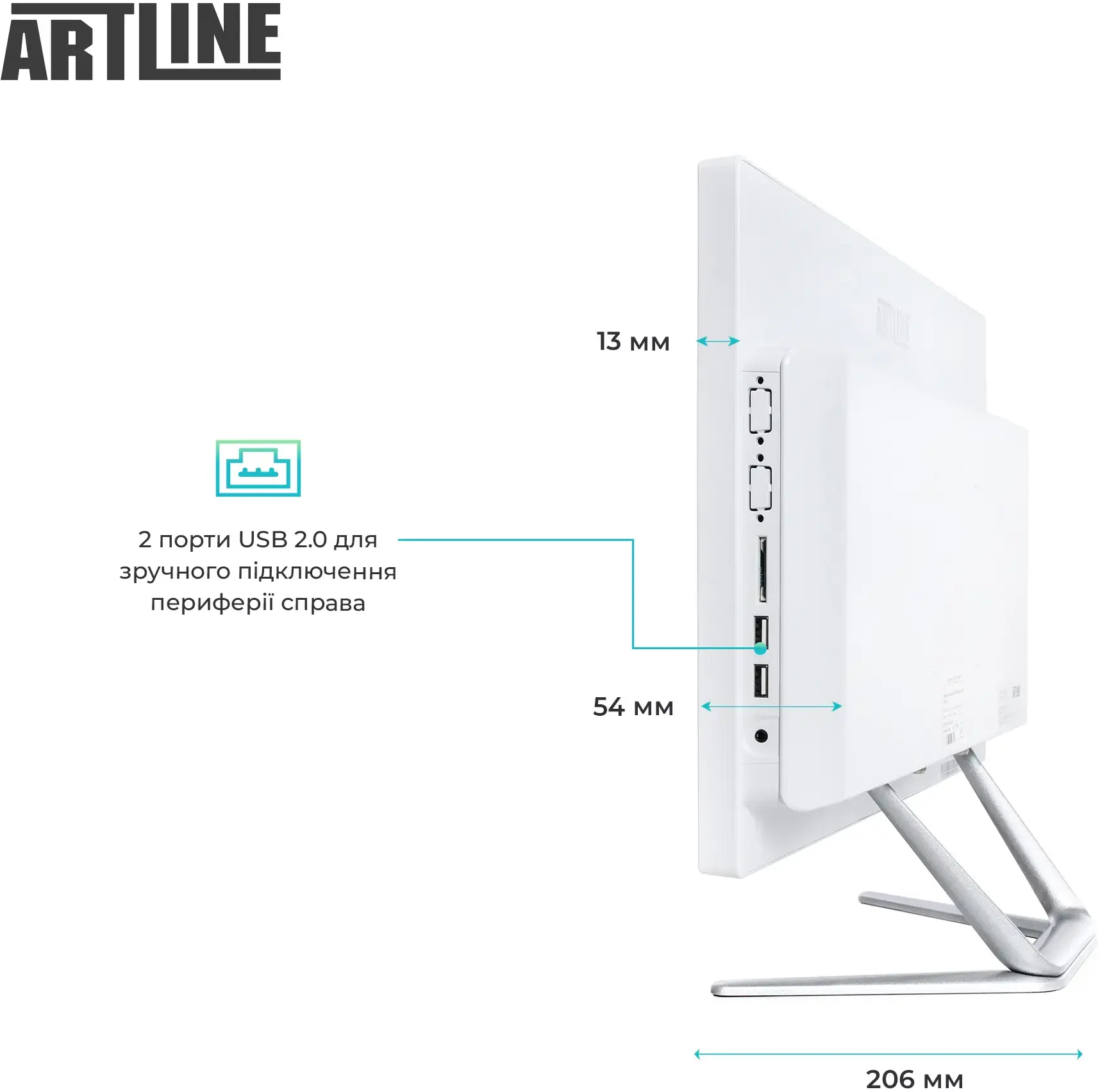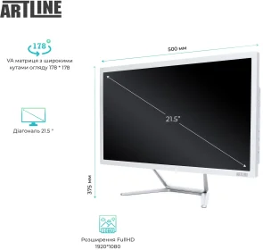 Моноблок виконаний у елегантному кольоровому поєднанні, яке гармонійно вписується як в офісний інтер’єр, так і в домашній кабінет. Компактний корпус Artline AiO G15W 21.5" Multitouch має мінімалістичний дизайн і продуману ергономіку. Пристрій важить лише 7 кг при розмірах 500 × 375 × 54 мм, завдяки чому легко розміщується навіть на невеликому робочому столі. Підтримка VESA-кріплення дозволяє за потреби закріпити моноблок на стіні або спеціальній стійці.