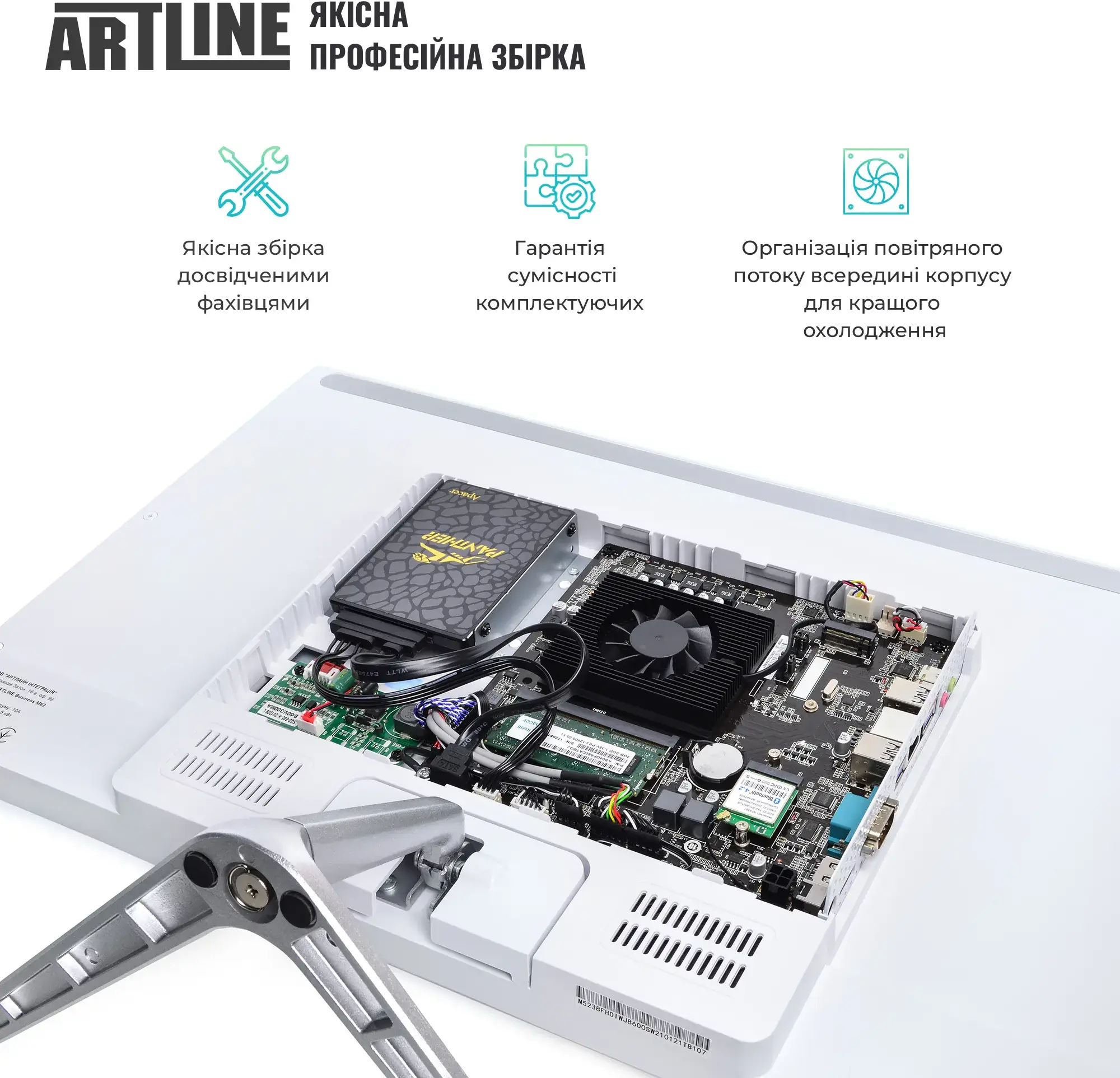 Моноблок ARTLINE Business M61 Windows 11 Pro (M61v41Win) – це сучасне рішення для дому та офісу, що поєднує стильний безрамковий дизайн та високу продуктивність. Пристрій оснащений 4-ядерним процесором Intel N95 із частотою до 3.4 ГГц, 8 ГБ оперативної пам'яті DDR4-3200 SODIMM та швидким SSD-накопичувачем об'ємом 120 ГБ. Яскравий 23.8-дюймовий IPS-екран з роздільною здатністю Full HD (1920x1080) забезпечує чітке та насичене зображення під будь-яким кутом огляду. Вбудована графіка Intel HD, веб-камера 1.3 Мп та стереодинаміки роблять роботу та спілкування максимально зручними. Моноблок підтримує Wi-Fi 802.11ac, оснащений портами USB 3.0, HDMI, LAN, COM та кардрідером. Корпус Artline AiO X5 відрізняється компактністю (539x403x57 мм) та легкістю (7 кг), а блок живлення потужністю 48 Вт забезпечує стабільну роботу. Поставляється в комплекті з блоком живлення, кабелем та документацією. Гарантія – 38 місяців. Колір – білий.