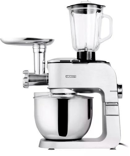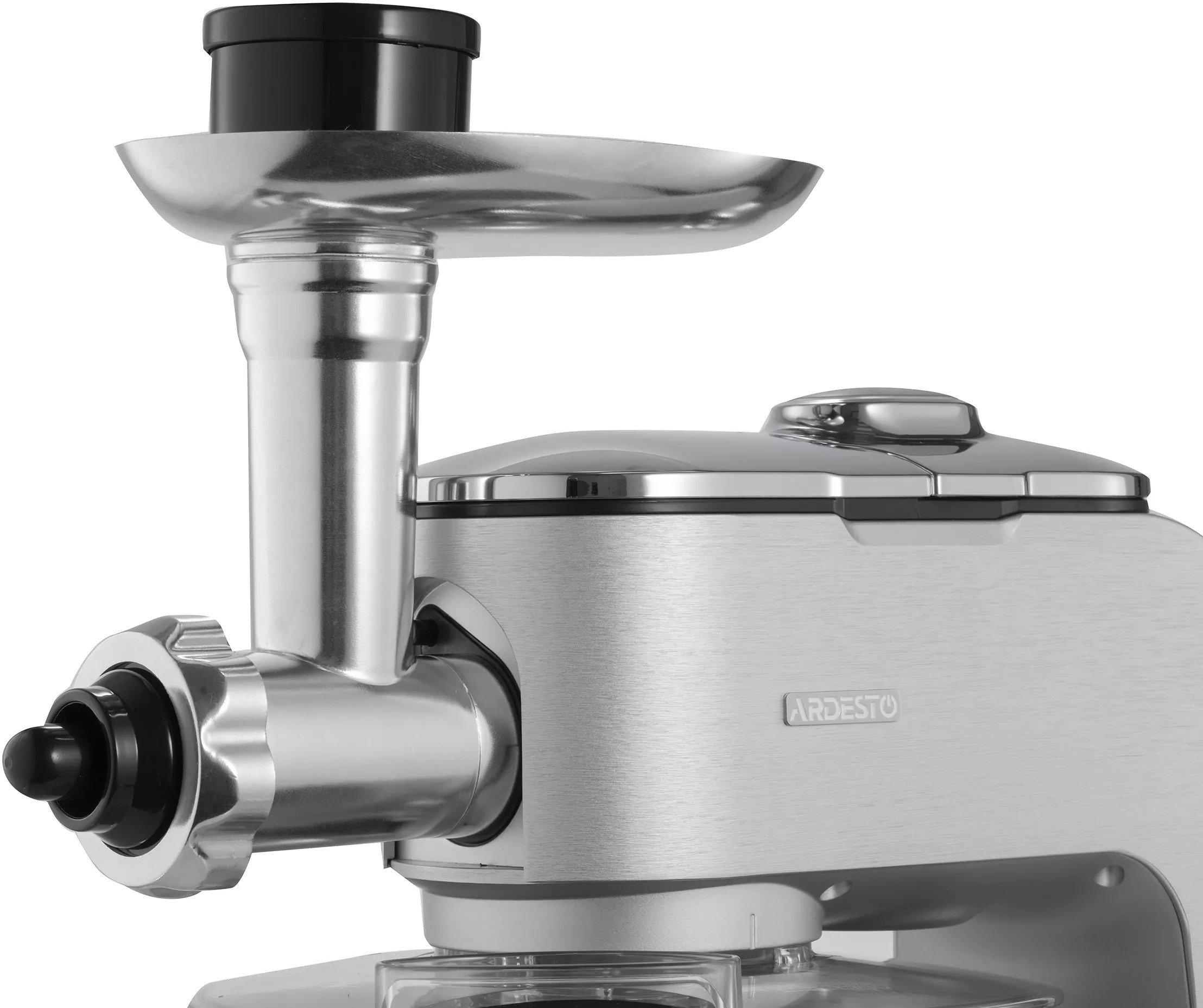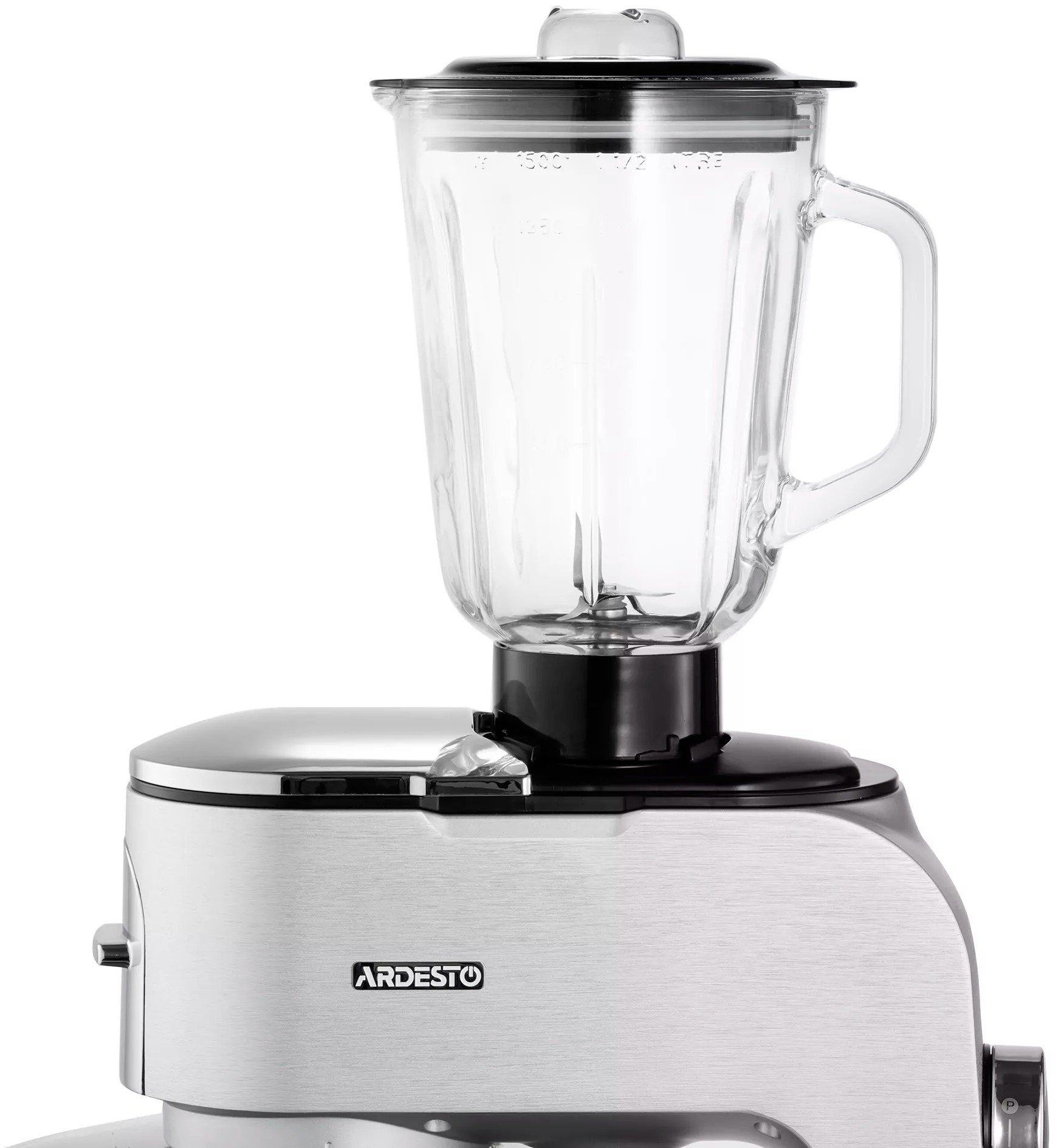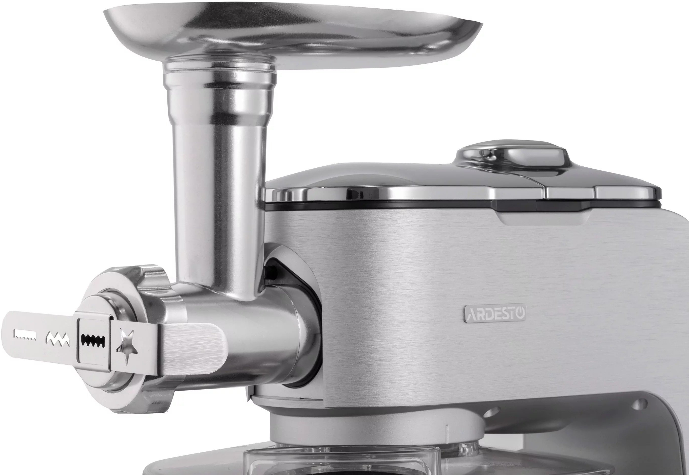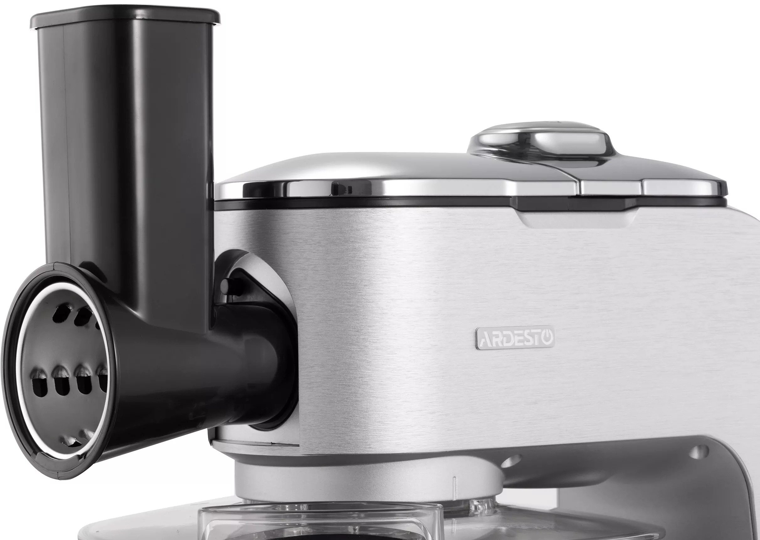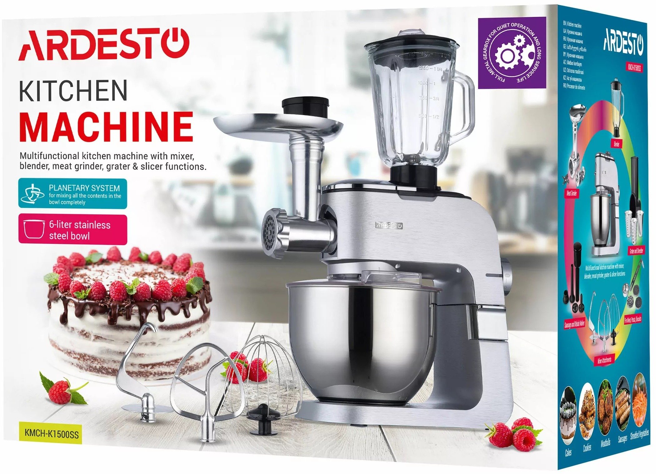 Ardesto KMCH-K1500SS можна сміливо назвати кухонною станцією, адже набір насадок відкриває практично необмежені можливості. У комплект входять вінчик, гак і насадка для замішування, які справляються з усіма видами тіста й кремів, а також насадки для печива, блендерна чаша на 1,5 л для смузі, соусів та супів-пюре, і навіть м’ясорубка з додатковими насадками, що дозволяє приготувати фарш, ковбаски або кеббе. Для оброблення овочів є комплект із трьох видів шатківниць, тож подрібнення інгредієнтів займає лічені хвилини — ідеально для великих обсягів приготування чи заготівель.