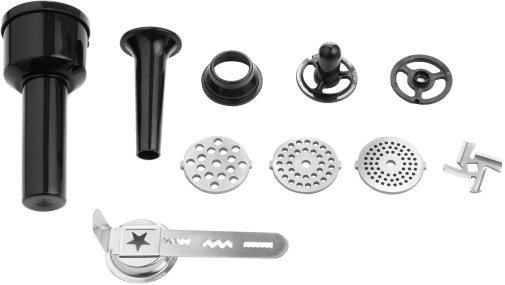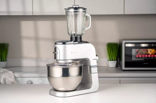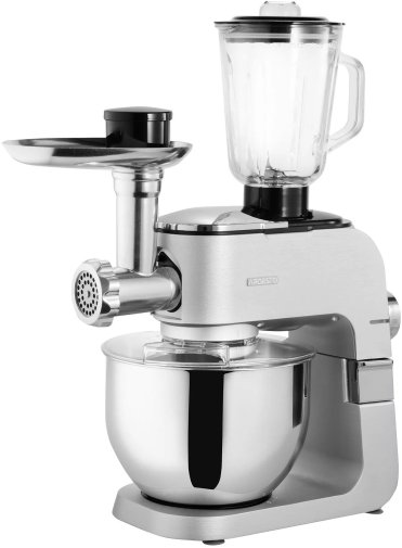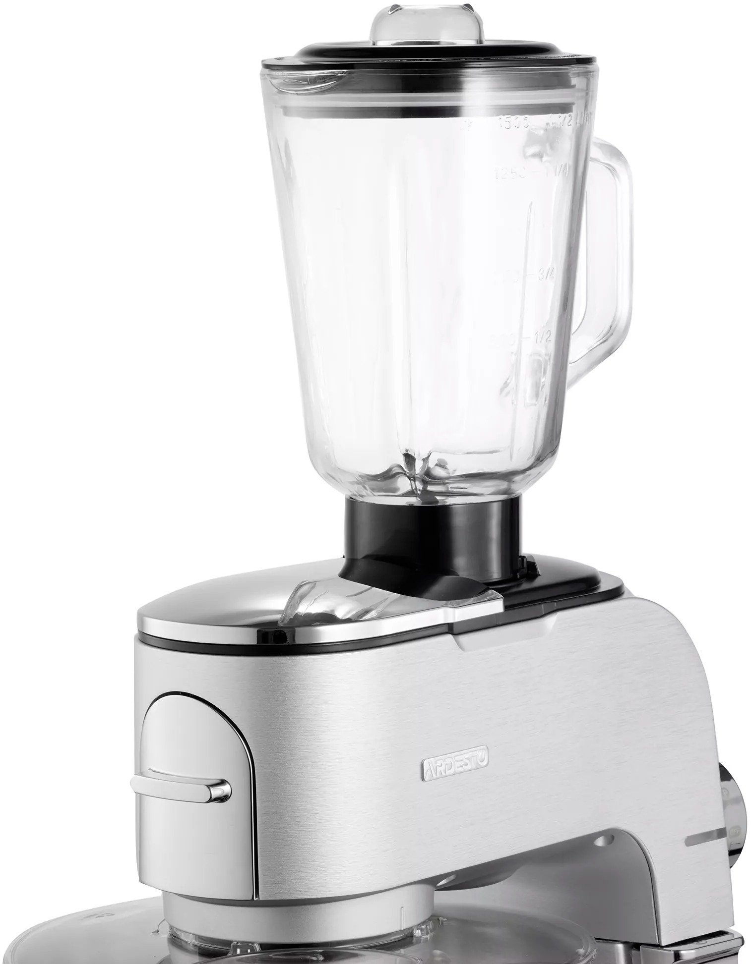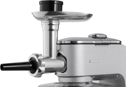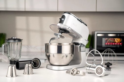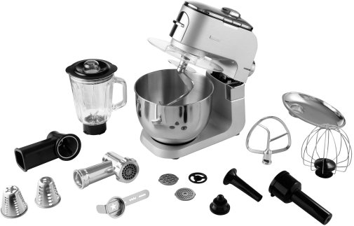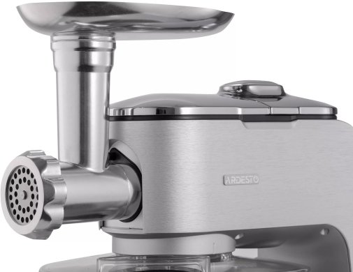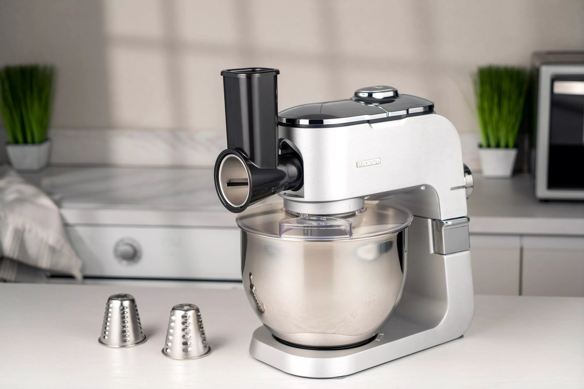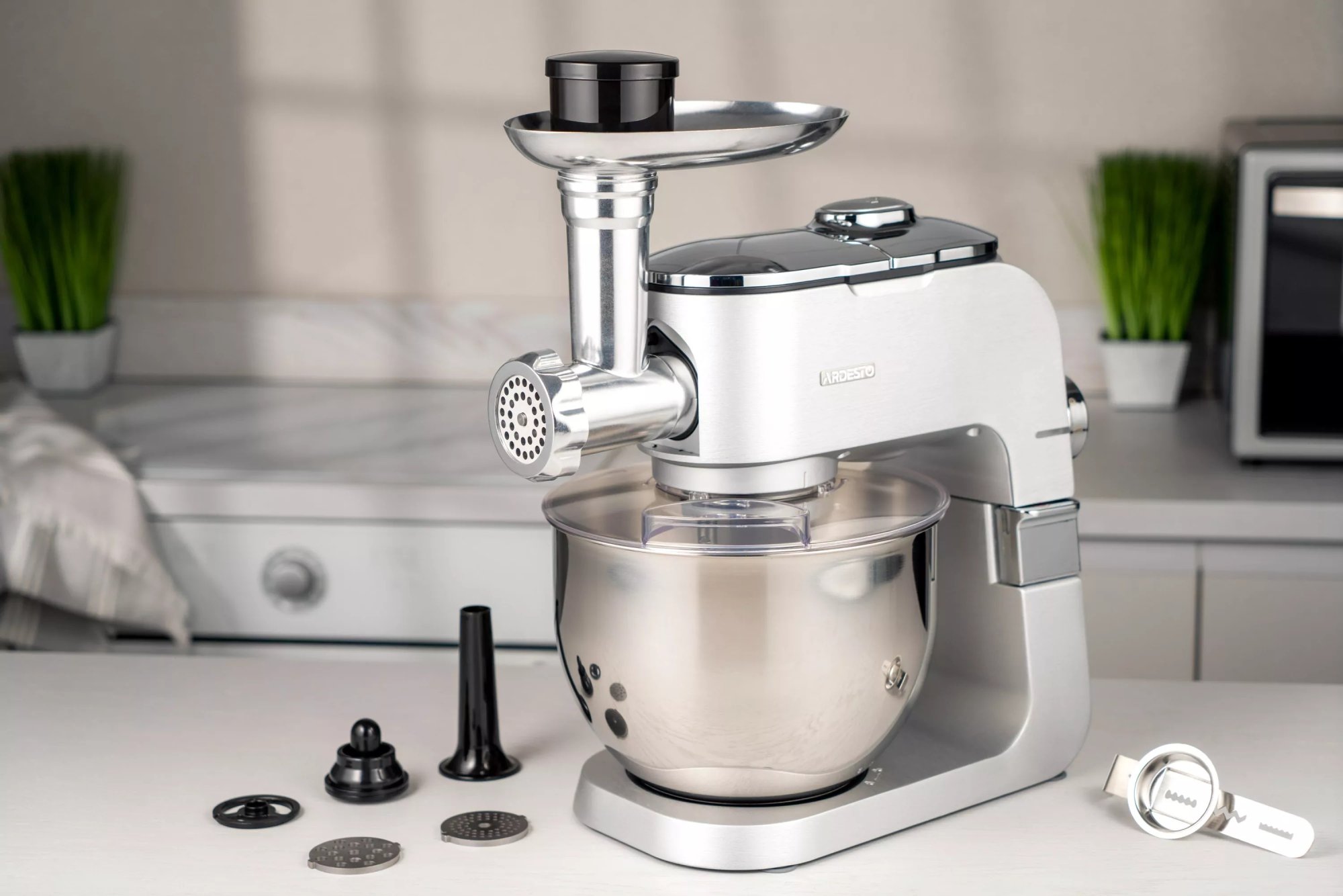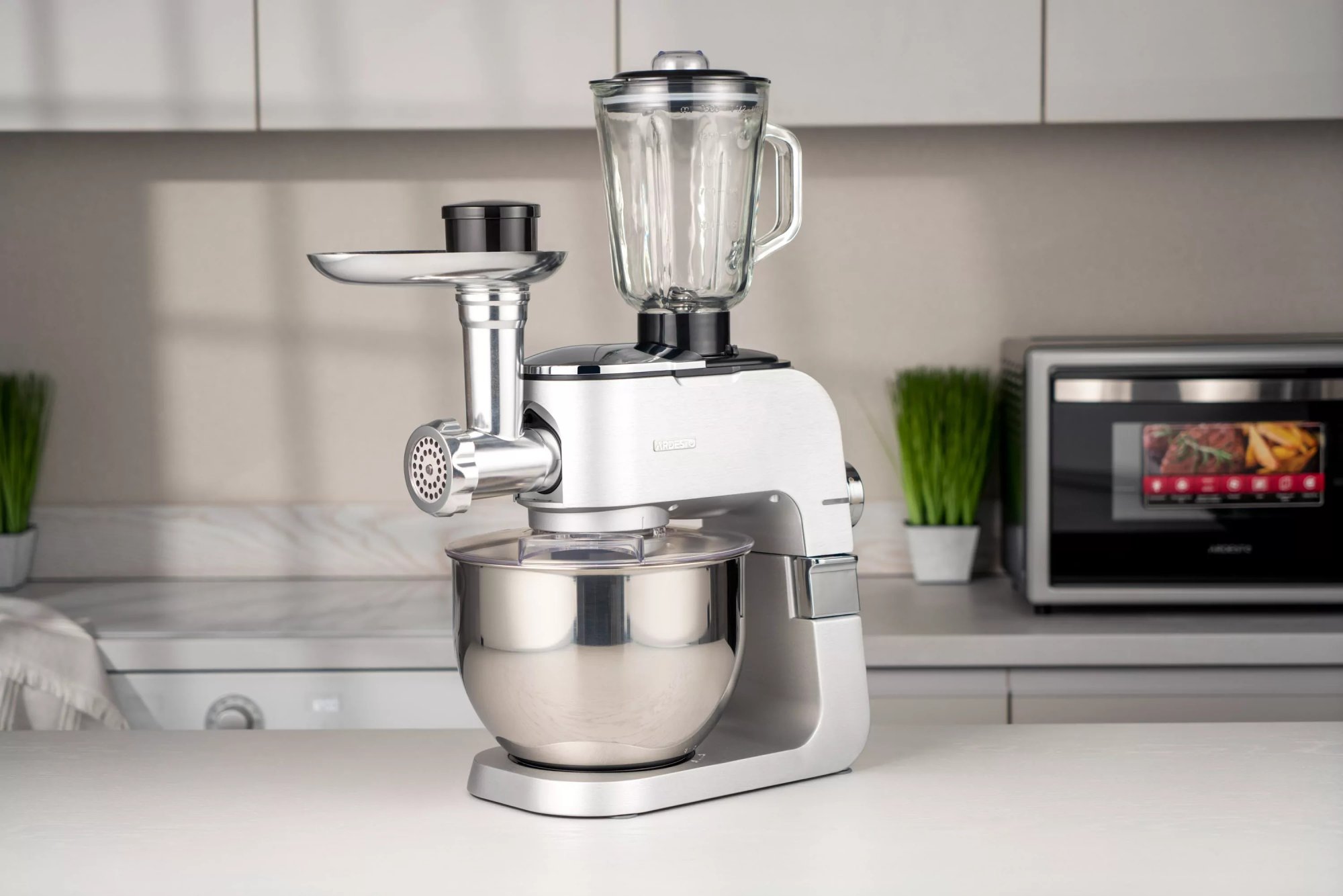 Ardesto KMCH-K1500SS можна сміливо назвати кухонною станцією, адже набір насадок відкриває практично необмежені можливості. У комплект входять вінчик, гак і насадка для замішування, які справляються з усіма видами тіста й кремів, а також насадки для печива, блендерна чаша на 1,5 л для смузі, соусів та супів-пюре, і навіть м’ясорубка з додатковими насадками, що дозволяє приготувати фарш, ковбаски або кеббе. Для оброблення овочів є комплект із трьох видів шатківниць, тож подрібнення інгредієнтів займає лічені хвилини — ідеально для великих обсягів приготування чи заготівель.