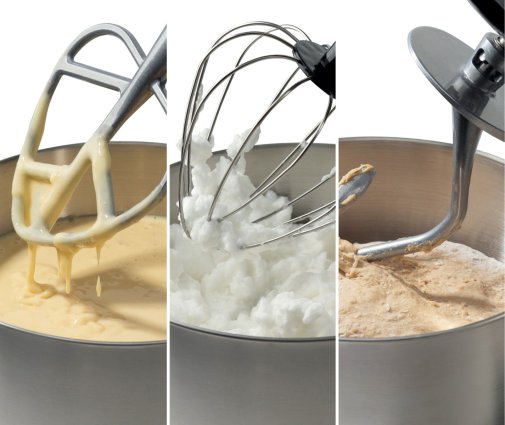 У комплект приладу входить гачок для тіста, вінчик і плоска насадка для збивання. Вінчик змішує інгредієнти; гак для тіста ефективно впорається навіть із найвибагливішим тістом; а насадка для збивання збиває відмінні вершки або ніжну білкову піну.