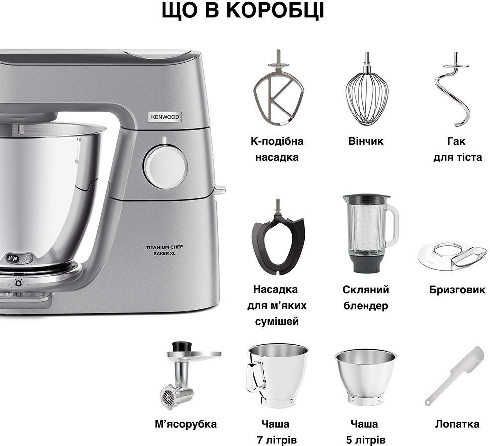 - К-подібна насадка для перемішування, виготовлений у фірмовому стилі з логотипом компанії Kenwood;