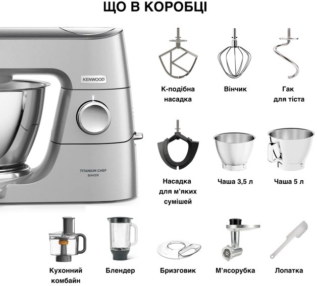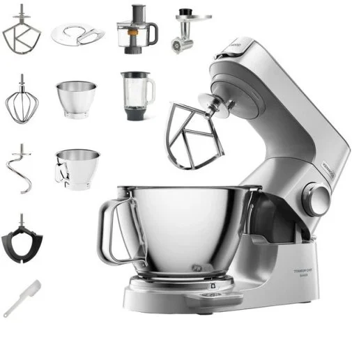 У стандартну комплектацію входять металеві чаші місткістю 5 та 3.5 л. Розмір та форма чаш підібрані таким чином, щоб насадки кухонної машини відповідали їм по ширині. До комплекту входить прозора захисна кришка, що запобігає розбризкуванню вмісту. Основні насадки: гак для тіста, вінчик, гнучкий збивач та К-подібна насадка. Також є насадки для приводів: фуд-процесор, м'ясорубка та блендер. Маючи Kenwood KVC 85.594 SI Titanium Chef Baker з його комплектацією, повністю зникає необхідність використання інших кухонних приладів.