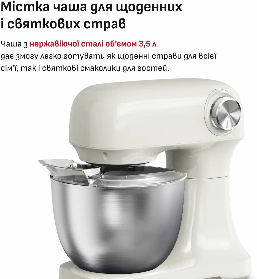 Безпека використання також на високому рівні: функція автоматичного вимкнення зупиняє роботу міксера, щойно верхня частина корпусу піднімається, гарантуючи повний спокій під час приготування.