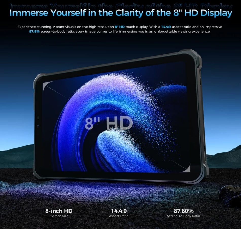 8-дюймовий HD-дисплей з роздільною здатністю 1280×800 та яскравістю 420 ніт чудово читається навіть під прямим сонячним світлом. Окремої уваги заслуговує акумулятор ємністю 11000 мАг — це один із найбільших показників серед захищених 8-дюймових планшетів. Такого заряду вистачає на кілька днів інтенсивного використання, а 18-ватна швидка зарядка дозволяє швидко відновлювати енергію.