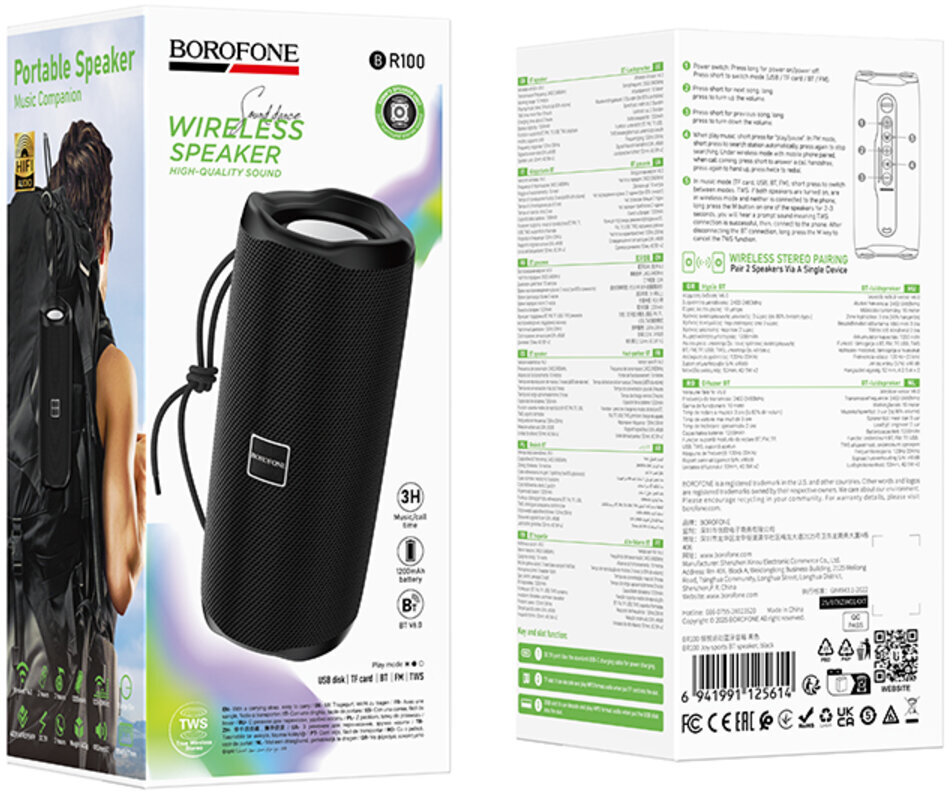 Особливо приємною особливістю є підтримка режиму TWS — дві такі колонки легко об’єднуються в стереопару, створюючи повноцінний просторовий звук. Компактні розміри 18×8×7 см роблять BR100 ідеальним супутником для прогулянок, пікніків, вечірок чи подорожей. Borofone BR100 — це вдале поєднання потужного звучання, надійності та свободи, створене для тих, хто хоче насолоджуватися музикою будь-де й будь-коли.