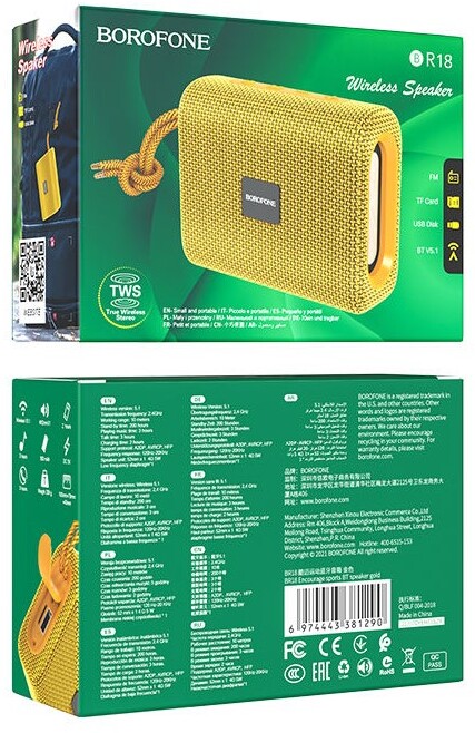 BOROFONE BR18 Encourage — це компактна портативна бездротова колонка, ідеальна для активного відпочинку, спорту та повсякденного використання. Завдяки легкій вазі лише та компактним розмірам, вона легко поміщається в кишені чи рюкзаку, дозволяючи брати улюблену музику куди завгодно.