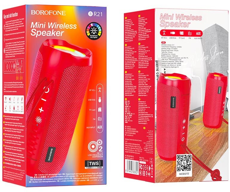 Колонка оснащена Bluetooth 5.1, що забезпечує стабільне з’єднання на відстані до 10 м і сумісність із пристроями на iOS, Android чи Windows. Підтримує режими відтворення: Bluetooth, FM-радіо, TF-карта, USB, AUX, TWS (для створення стереопари з іншою BR21). Два 45-мм динаміки загальною потужністю 10 Вт (5 Вт кожен) створюють гучний і чистий звук із помірними басами, придатний для музики, подкастів чи дзвінків. Частотний діапазон — 120 Гц–18 кГц, що забезпечує збалансоване звучання для компактного пристрою.