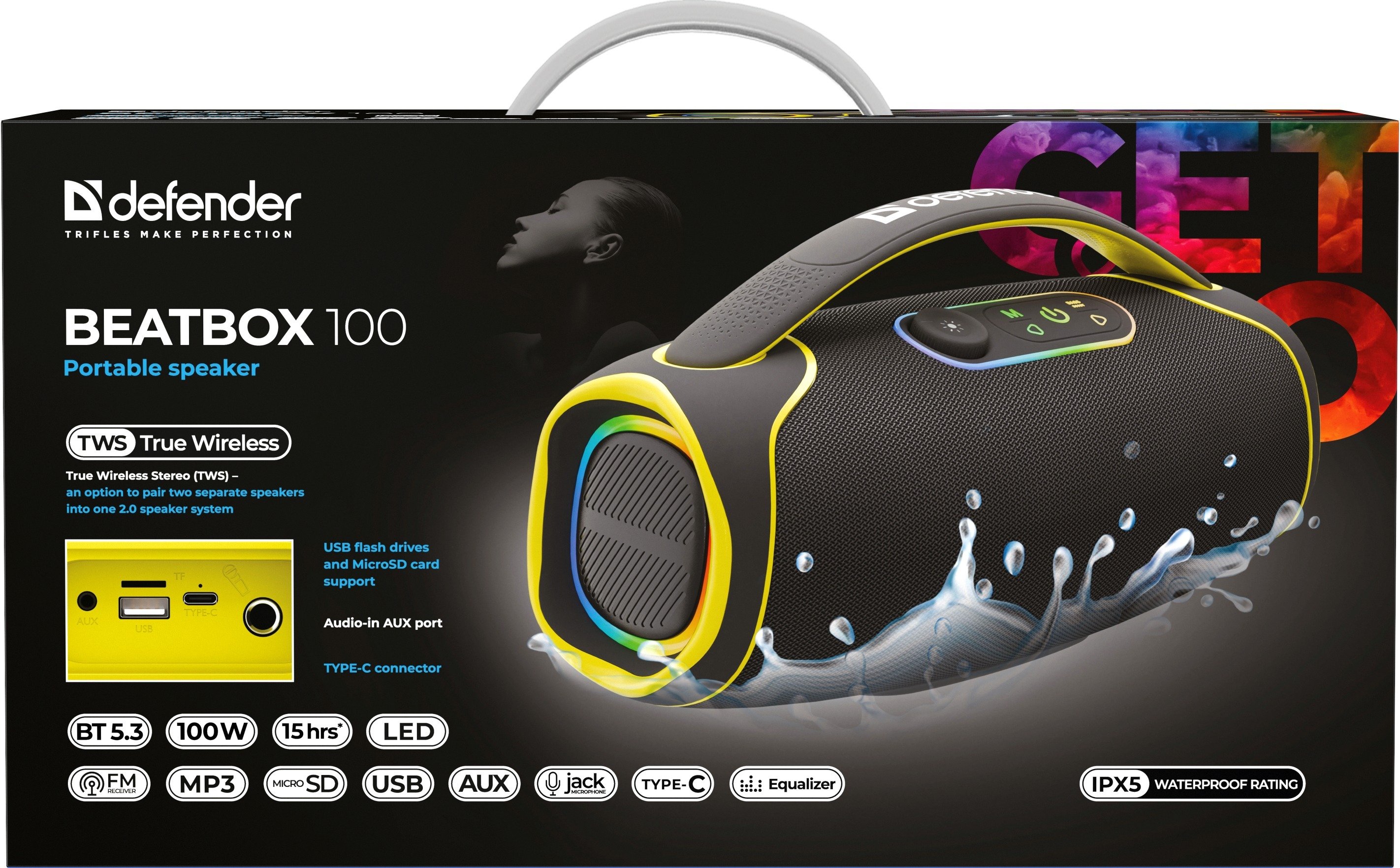 Defender Beatbox 100 - це універсальне рішення для тих, хто шукає потужний вуличний звук, де 100 Вт стерео з DSP поєднуються з IPX5-захистом та TWS, перетворюючи повсякденне прослуховування на динамічний і безтурботний процес для стабільної розваги в будь-якому середовищі без зайвих витрат чи обмежень.
