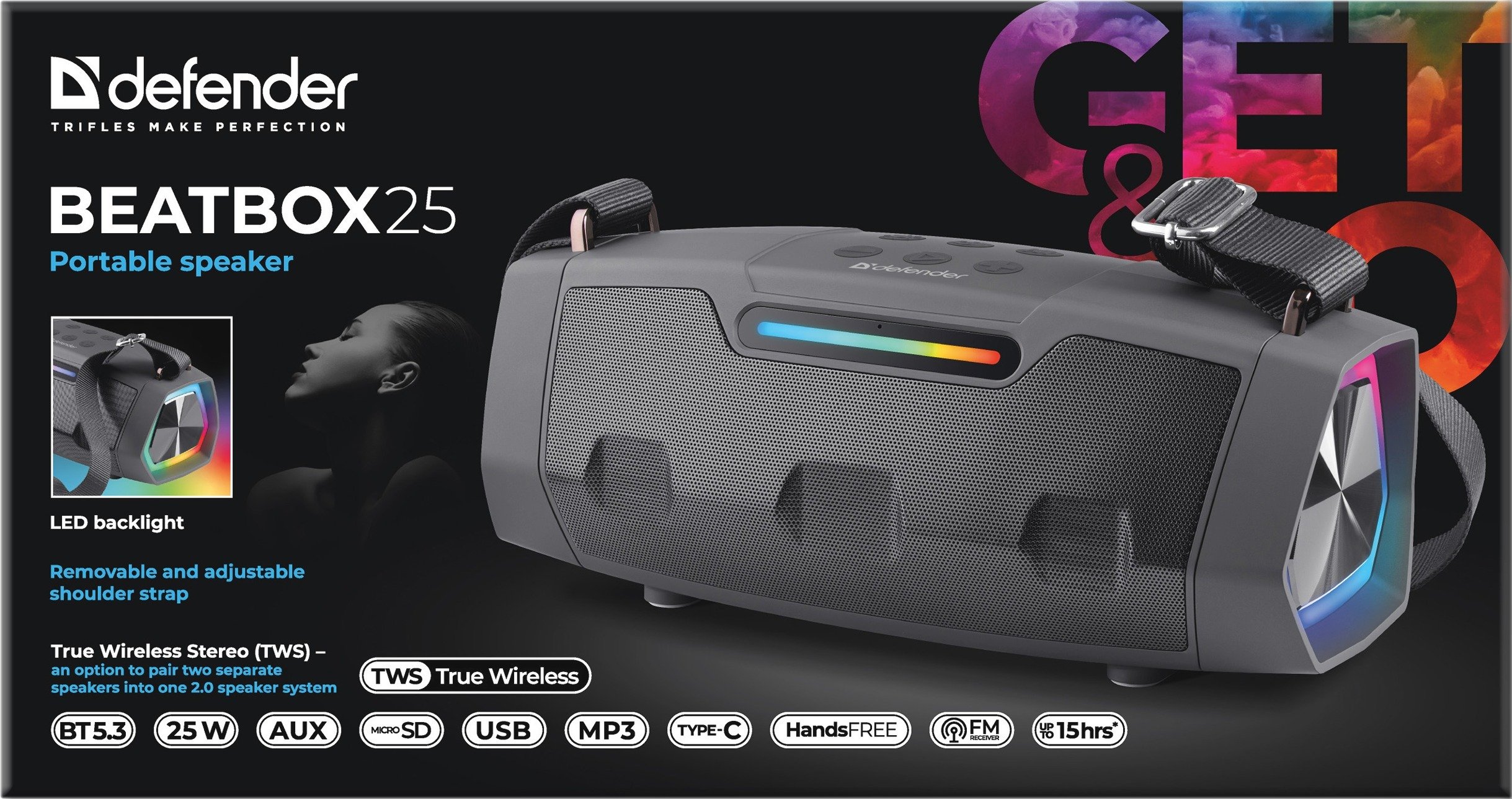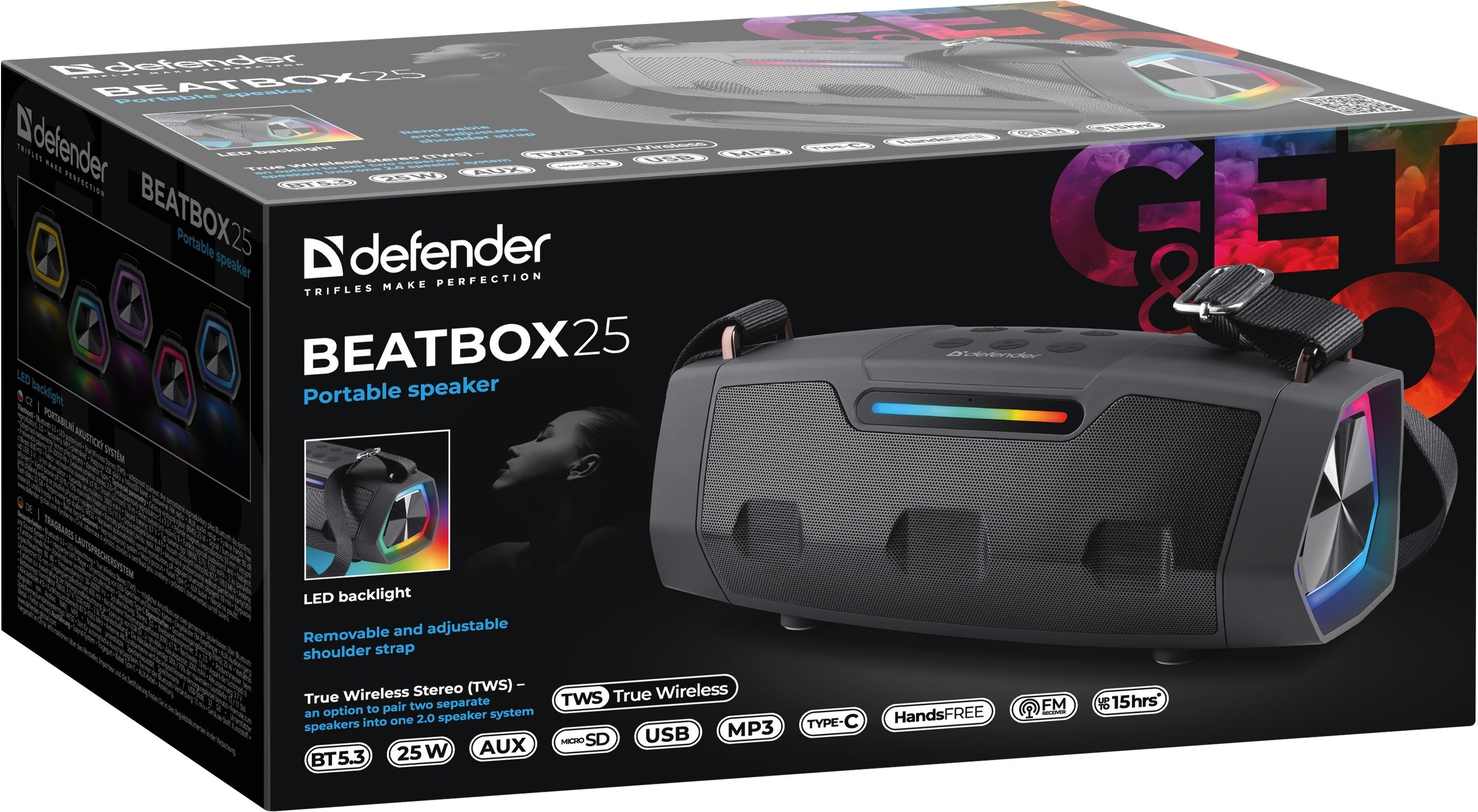 Світлодіодне підсвічування додає колонці стильного вигляду і створює атмосферу під час прослуховування музики, а всі особливості разом роблять Defender Beatbox 25 ідеальним рішенням для активного відпочинку, подорожей і щоденного використання.