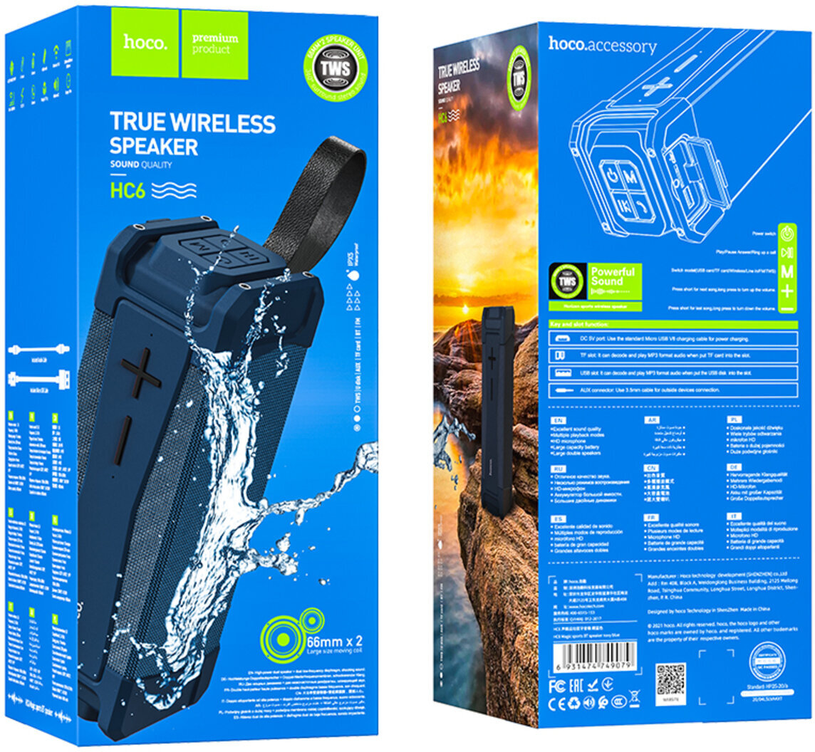 Міцний корпус з високоякісних компонентів робить колонку стійкою до ударів та падінь зі столу або під час руху, а рівень захисту IPX6 забезпечує стійкість до води та бризок. Завдяки цьому Hoco HC6 ідеально підходить для активного відпочинку та розваг на природі — пікніків, вечірок біля басейну, походів на пляж або в гори. Компактні розміри та портативний дизайн дозволяють брати колонку з собою будь-куди, насолоджуючись улюбленою музикою без обмежень.
