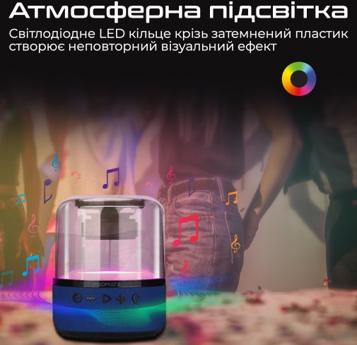 Стильна портативна колонка Promate Glitz-L видає 10W насиченого та об'ємного звучання на 360°. А неймовірна ілюмінація за технологією LumiSound заповнить яскравими фарбами будь-який простір.