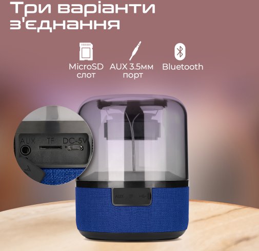Слухай музику через Bluetooth (до 10 м), MicroSD карту (до 32 Гб), або під'єднавши ґаджет за допомогою 3.5 мм аудіо-кабелю (AUX), який йде в комплекті.