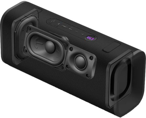 У чорному матовому корпусі з м’якими кутами та гумовими вставками ULT Field 3 виглядає стильно, але водночас по-бойовому. Вона не боїться нічого: занурюється у воду на глибину до 1 м на 30 хвилин, витримує дощ, бризки, пісок і пил, падає з 1.2 м на бетон і продовжує грати. З ремінцем із міцного нейлону її легко чіпляти на рюкзак, велосипед чи гілку. Вагою всього 1.2 кг, але звук — як від домашньої 2.1 системи.