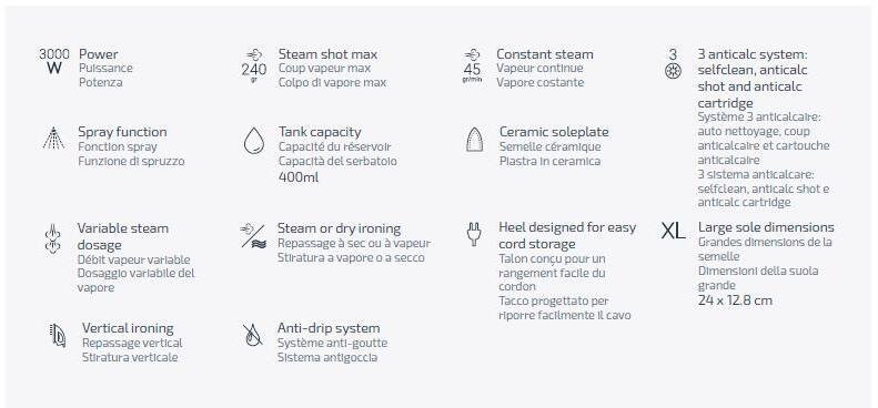 Праска оснащена системою Calc'n Clean та трирівневою системою захисту від накипу (самоочищення, антикальк-шот, антикальк-картридж), що забезпечує довговічність пристрою та чистоту внутрішніх елементів. Протикапельна система запобігає появі крапель на тканинах, а функція розпилення допомагає обробляти складні ділянки одягу.