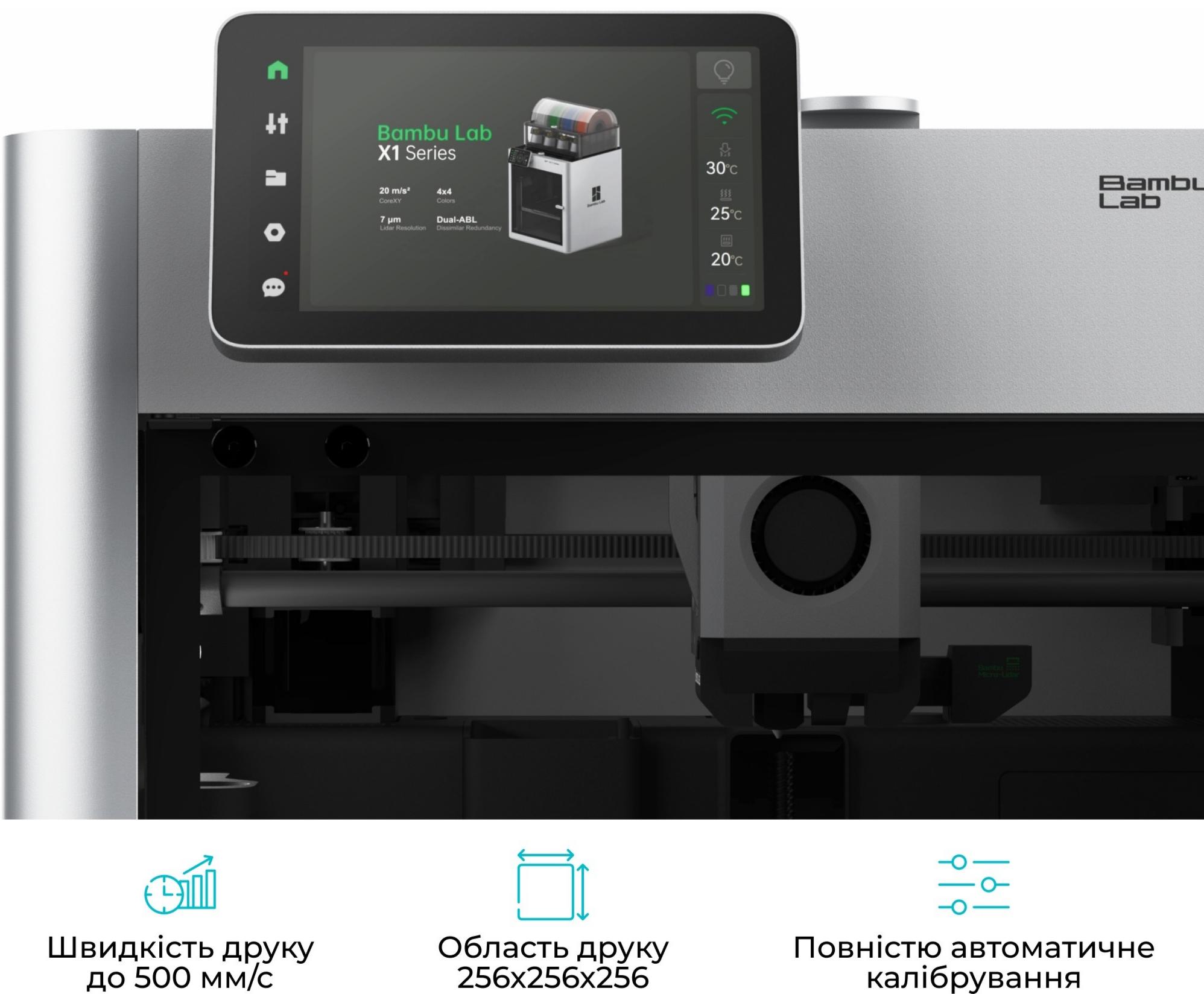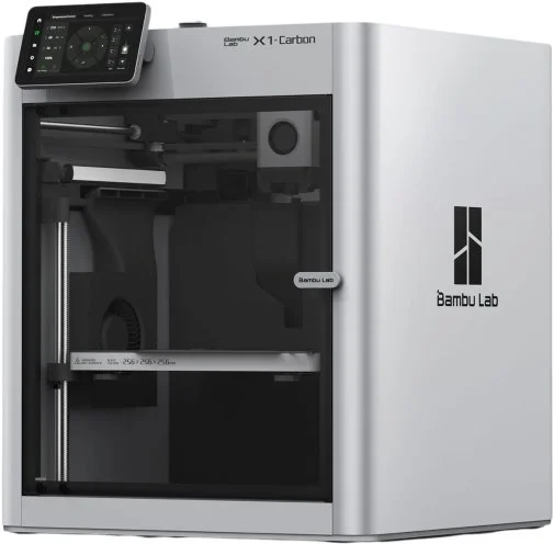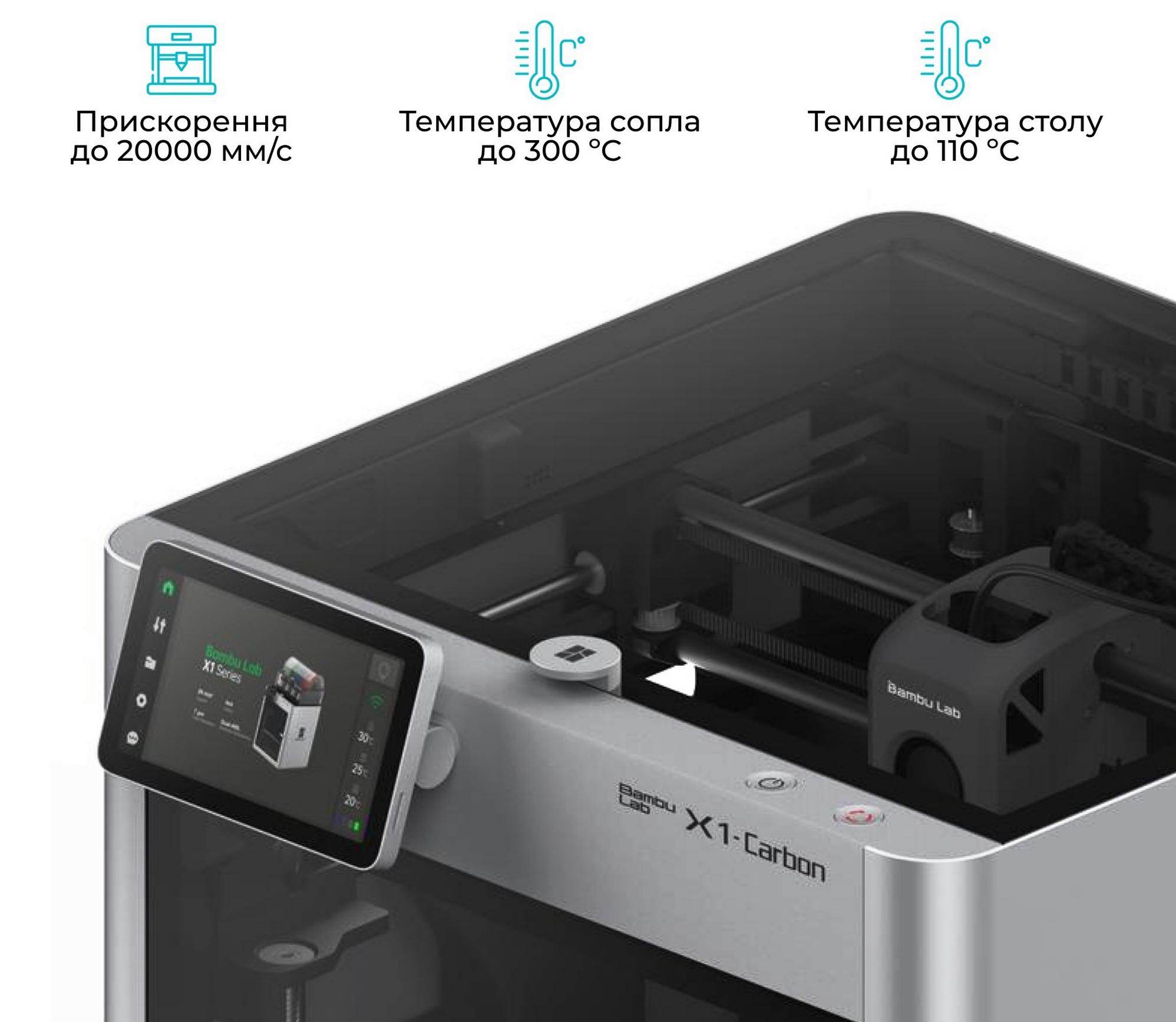 3D принтер Bambu Lab X1 Carbon — це високотехнологічний пристрій, який задовольнить потреби як професіоналів, так і ентузіастів у сфері адитивного виробництва. Принтер має вражаючий робочий об'єм 256 x 256 x 256 мм, що дозволяє створювати об'єкти значних розмірів. Однією з ключових особливостей цієї моделі є висока швидкість друку, що досягає 500 мм/с, що значно скорочує час виробництва. Прискорення до 20 000 мм/с² забезпечує точну та швидкодійну роботу, що особливо важливо при створенні складних і детальних моделей.