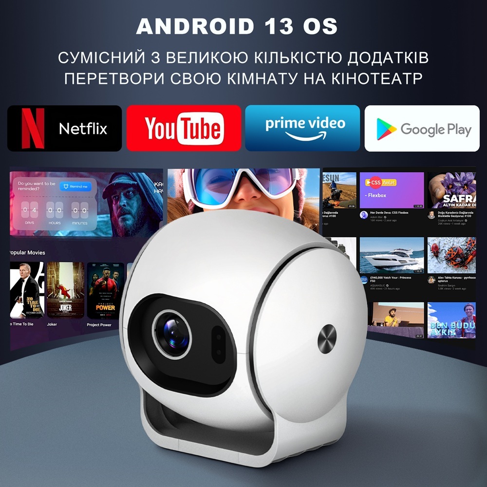 Проєктор працює на Android-платформі (Smart-функції), що дозволяє встановлювати додатки (YouTube, Netflix, Megogo тощо) безпосередньо на пристрій — не потрібен додатковий стік чи приставка для базового використання. Енергоспоживання низьке, LED-лампа служить десятки тисяч годин.