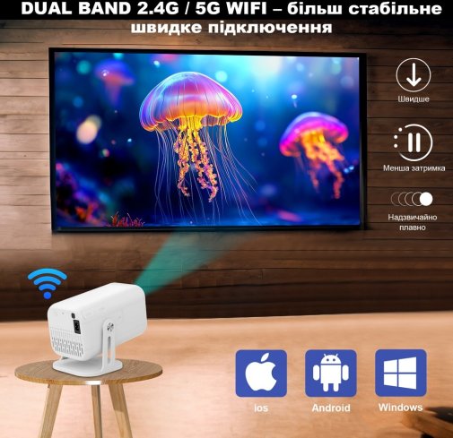 Особлива перевага — операційна система Android 13, що робить проєктор повноцінним смартпристроєм: встановлюйте додатки (YouTube, Netflix, Megogo, IPTV тощо) безпосередньо на проєктор без додаткових приставок. Підтримка автофокусу та автовирівнювання (keystone correction) спрощує налаштування — проєктор сам підлаштовує картинку по вертикалі та горизонталі для ідеальної геометрії. Додатково є 210° гнучке кутове налаштування (ротація корпусу), що дозволяє проєктувати з будь-якого положення — на стелю, стіну чи навіть під кутом.