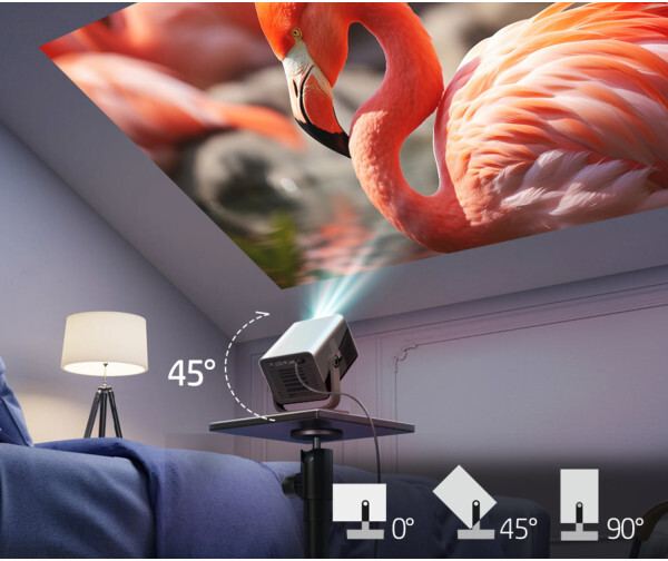 Пристрій використовує енергоефективне LED-джерело світла з ресурсом роботи до 20 000 годин, що гарантує тривалу експлуатацію без заміни лампи. Вбудовані динаміки потужністю 3 Вт забезпечують базовий звук, а для кращої якості можна під'єднати зовнішню акустику через 3,5 мм аудіовихід. Поворотний дизайн корпусу дозволяє регулювати кут проєкції від 0 до 90 градусів, роблячи встановлення максимально гнучким.