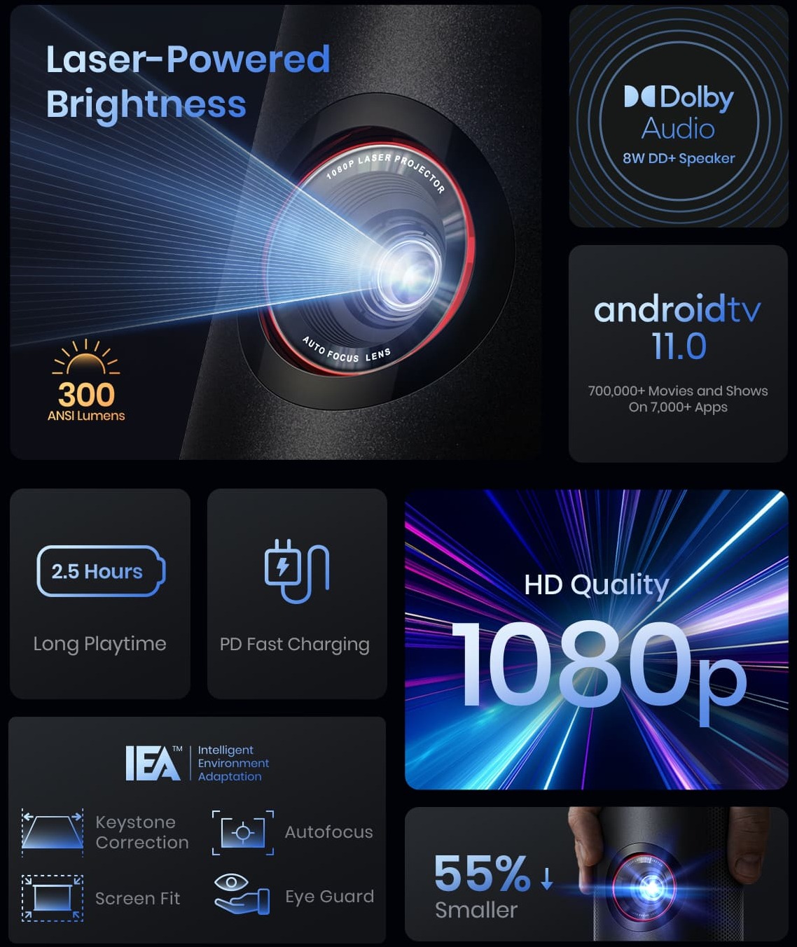 Проектор автоматично налаштовує зображення завдяки автофокусу та корекції трапеції, тому чітке відображення забезпечується всього за 3 секунди. Смарт-система адаптується до умов освітлення, а захист для очей знижує напруження під час перегляду.