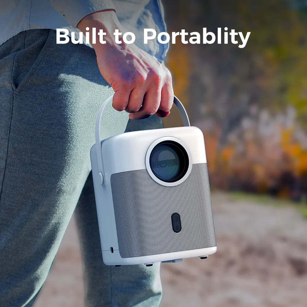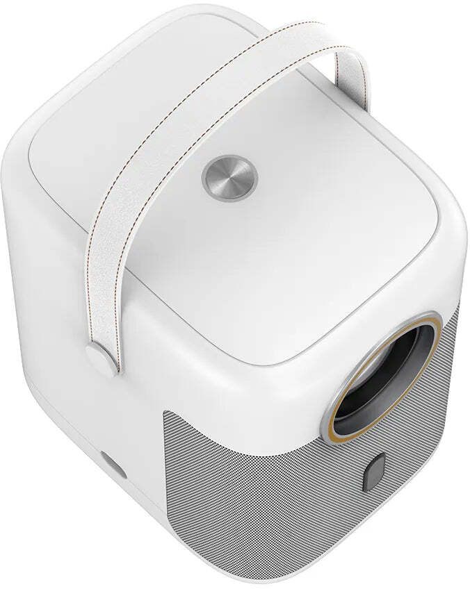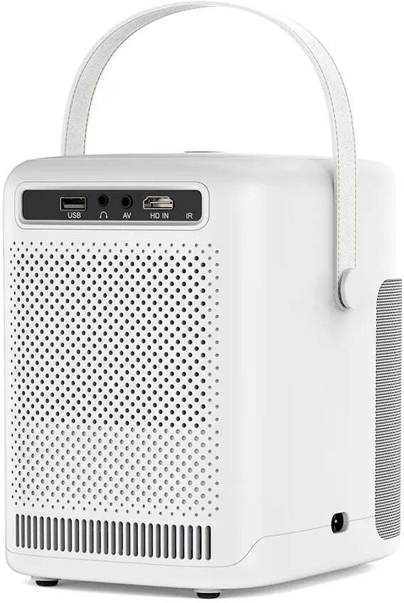 Шкіряна ручка та вертикальний дизайн проєктора додають йому стилю та індивідуальності, виділяючи його та економлячи простір. Його гнучкість дозволяє легко регулювати кут огляду для різних середовищ, забезпечуючи чітке та яскраве проєкційне зображення для покращеного перегляду в різних умовах.