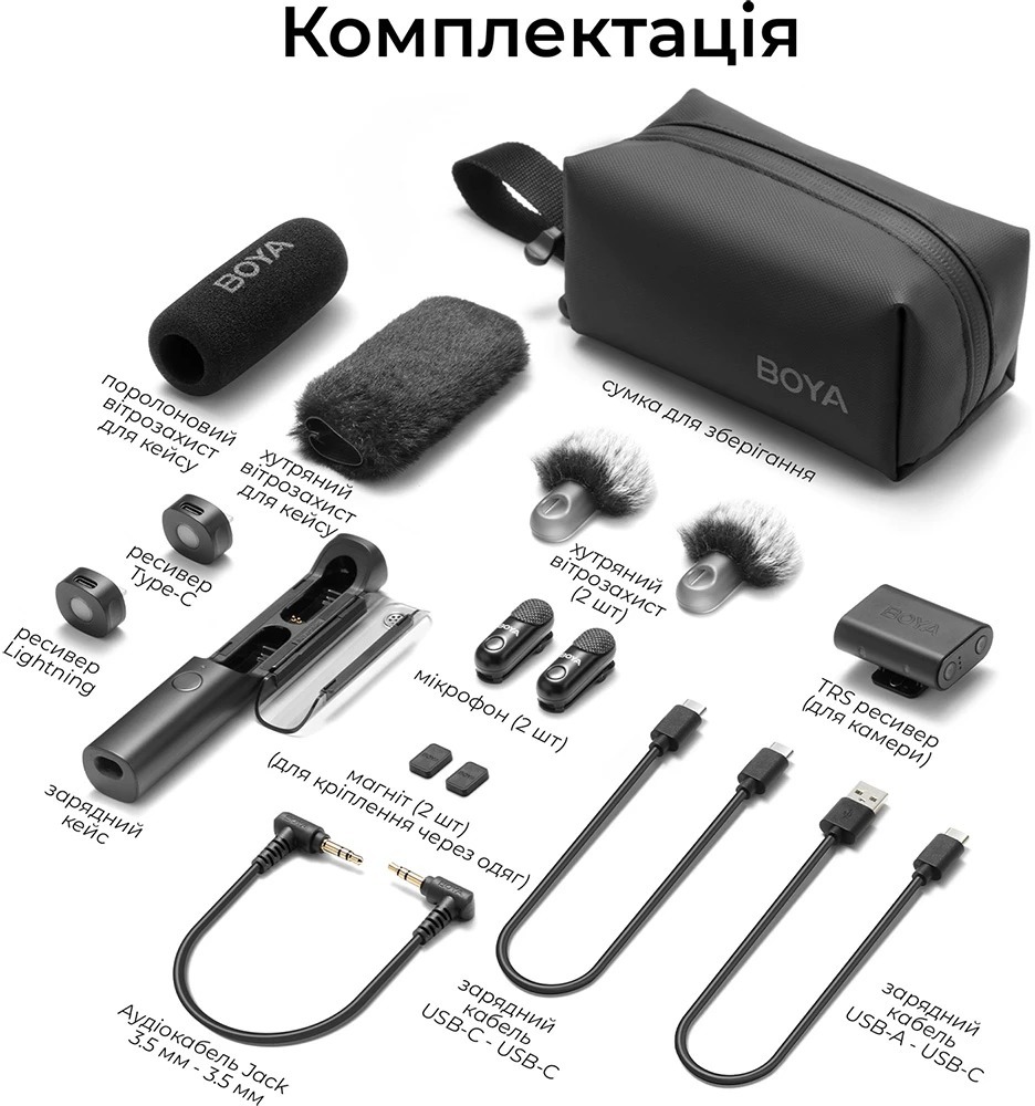 Мікрофон BOYA Magic-07 постачається в комплекті з двома мікрофонами та ресивером, що підтримує підключення через Type-C, Lightning та TRS для камери. Це дозволяє використовувати пристрій з різноманітними сучасними гаджетами, забезпечуючи універсальність і гнучкість у роботі. У комплект також входять кейс для зберігання, аудіокабель 3,5 мм Jack – Jack, зарядні кабелі USB-A – USB-C та USB-C – USB-C, а також 2 магнітні фіксатори та хутряні вітрозахисні екрани.