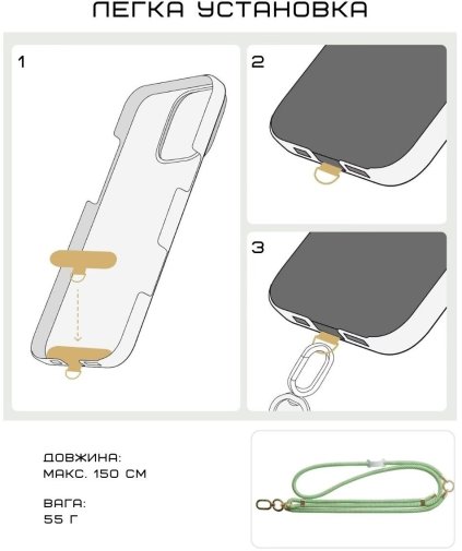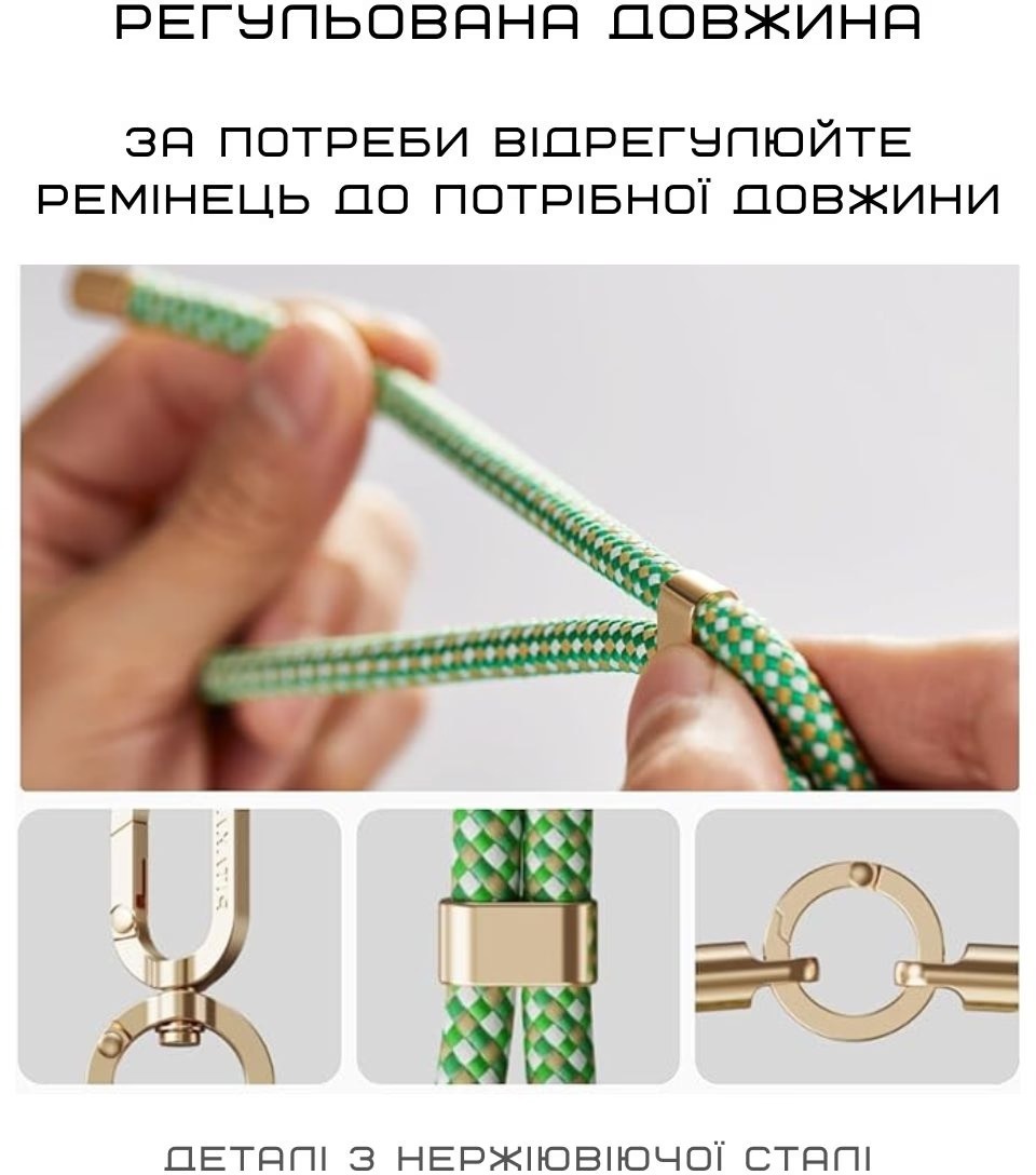 Головною перевагою є регульована та знімна конструкція, що дає змогу швидко змінювати режим носіння без додаткових аксесуарів. Ремінець надійно фіксує смартфон, запобігаючи падінням і вислизанню, особливо коли руки зайняті або ви рухаєтеся. Це ідеальне рішення для тих, хто часто фотографує, знімає відео чи просто хоче звільнити руки.