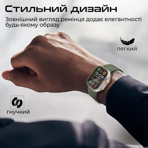 У центрі конструкції — потужні магніти N54, які забезпечують міцне зчеплення ремінця та легке регулювання довжини. Завдяки цьому ремінець щільно фіксується на зап’ясті, не ковзає і водночас зручно знімається одним рухом.