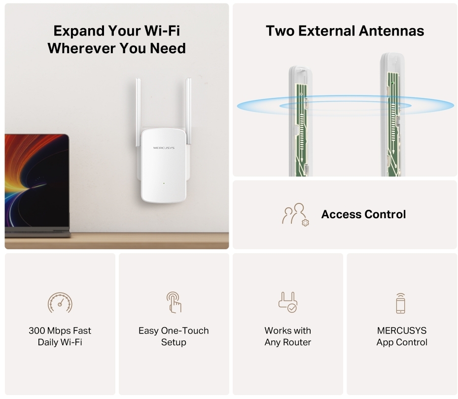 Репітер Wi-Fi Mercusys ME12 — це просте та ефективне рішення для тих, хто хоче назавжди позбутися «мертвих зон» у будинку чи невеликому офісі. Пристрій підтримує стандарт AC1300 і створює мережу 2,4 ГГц для повсякденного серфінгу, тому кожен гаджет отримує саме ту швидкість, яка йому потрібна.