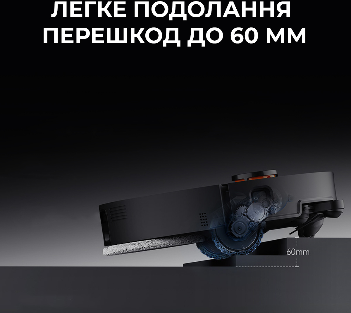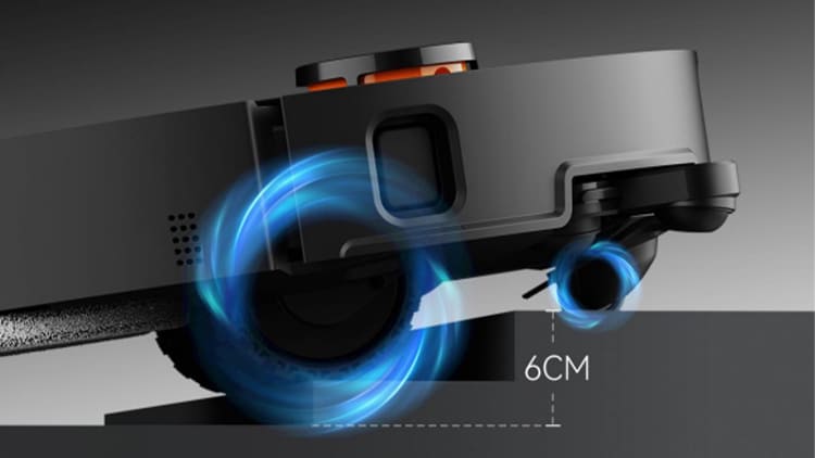 Механічні колеса з підйомом до 60 мм долають перешкоди та перепади висоти, а автоматичний плаваючий кожух знижує силу удару, продовжуючи термін служби пристрою. Унікальна конструкція щіток з аеродинамічними вставками запобігає заплутуванню волосся та спрямовує його до пилозбірника.