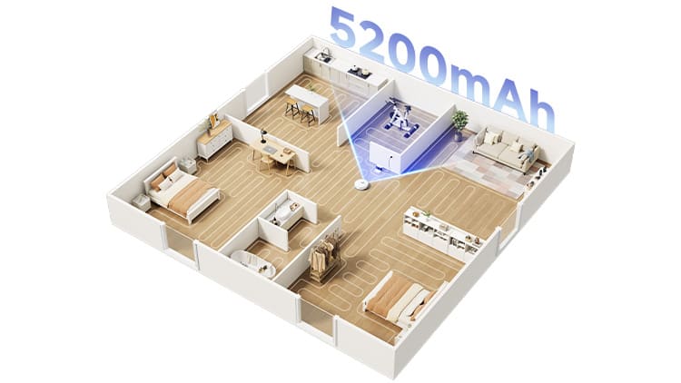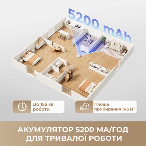 Акумулятор місткістю 5200 мАг забезпечує до 155 хвилин автономної роботи, дозволяючи прибрати до 145 м² за один цикл. Після розрядки робот автоматично повертається на станцію для заряджання та продовжує прибирання з того місця, де зупинився.