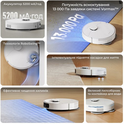 Управління через застосунок Dreamehome робить процес прибирання простим і зрозумілим: можна створювати карти до чотирьох поверхів, налаштовувати режими всмоктування та прибирання, встановлювати віртуальні межі та заборонені зони для миття підлоги.