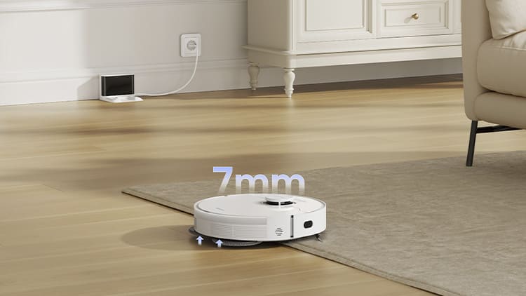 Для прибирання килимів робот використовує ультразвукове виявлення поверхонь, піднімаючи швабру та збільшуючи потужність всмоктування для глибокого очищення. Повністю гумова роликова щітка ефективно видаляє пил і волосся, не заплутуючись у ворсі. Система Anti-Tangle з дрібнозубчастою конструкцією та прогумованим роликом під кутом 50° запобігає заплутуванню і підвищує ефективність збору сміття.
