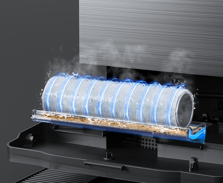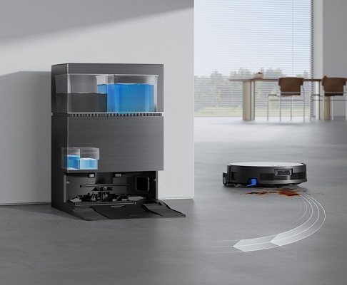 Станція OMNI нового покоління доповнює автономність робота: вона забезпечує миття ролика гарячою водою при 75°C, використовує автоматичне перемикання між стандартним і посиленим миючим засобом та підтримує повний цикл очищення — від миття до сушіння. Мінімалістичний дизайн зі сталевими акцентами робить станцію не лише функціональною, а й естетично привабливою.