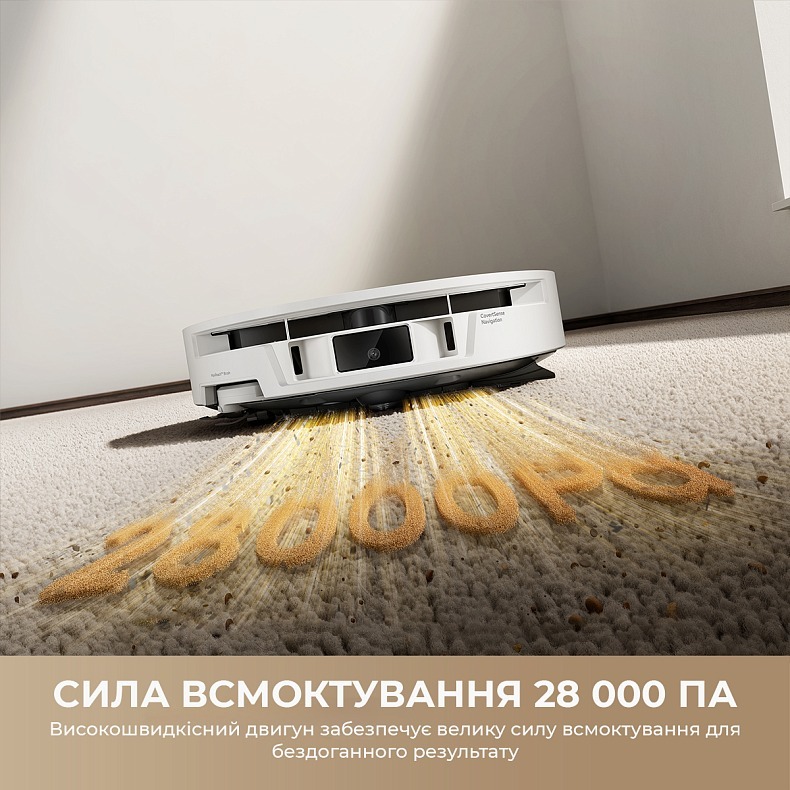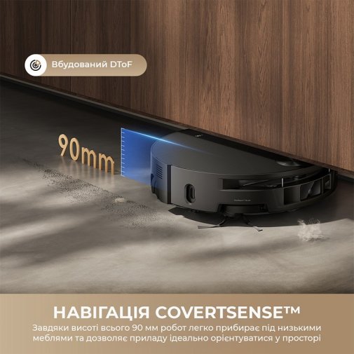 Навігація DToF CovertSense дозволяє роботу точно орієнтуватися в просторі навіть у темряві, при цьому висота корпусу лише 90 мм дає змогу проходити під меблями. Робот будує точні карти приміщення та адаптує маршрут, уникаючи хаотичних рухів і пропусків зон, що підвищує якість покриття кожного квадратного метра.