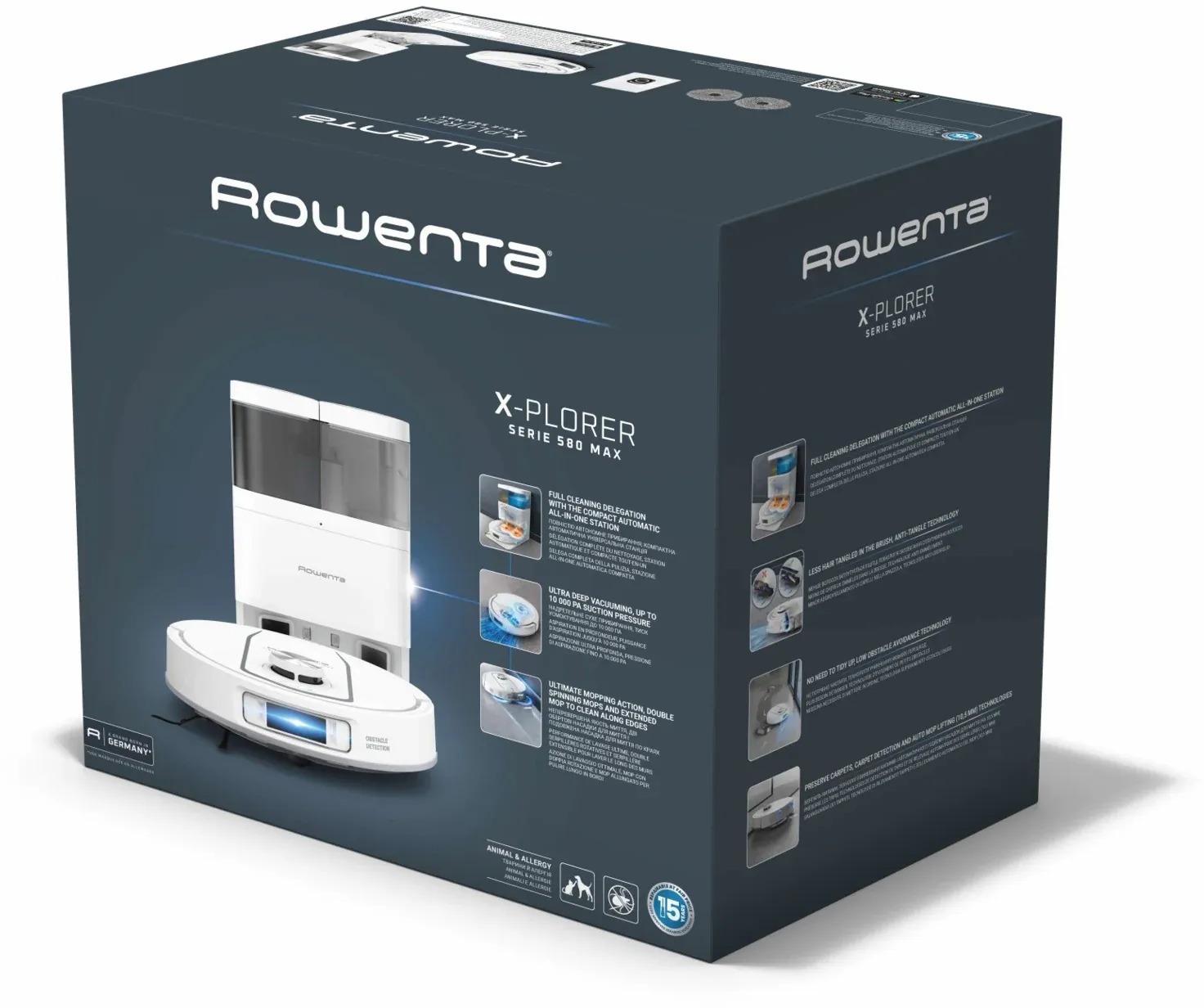Робот-пилосос Rowenta X-Plorer Serie 580 Max Animal — це інтелектуальне рішення для повного прибирання дому з компактною станцією 4-в-1, яка дозволяє повністю делегувати домашні обов’язки. Система станції автоматично висушує гарячим повітрям, очищує мопи, зволожує їх та спорожнює контейнер для сміття і брудної води, забезпечуючи абсолютну автономність та мінімальне втручання користувача.